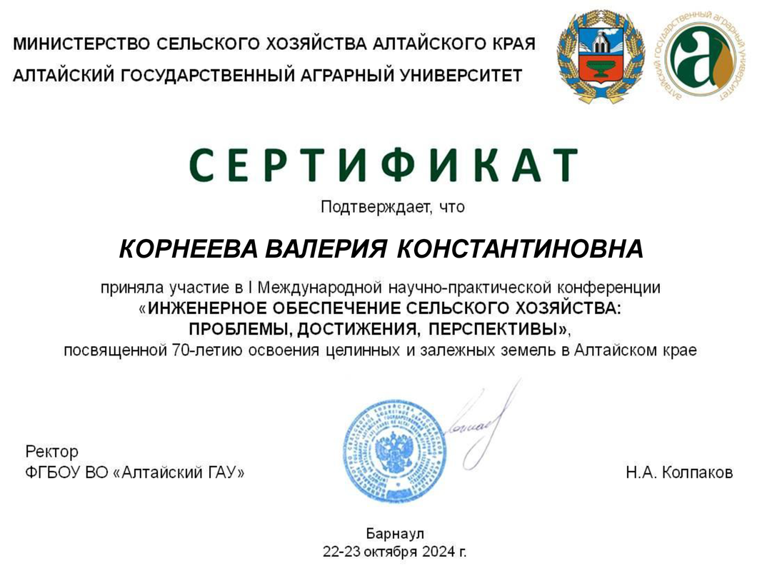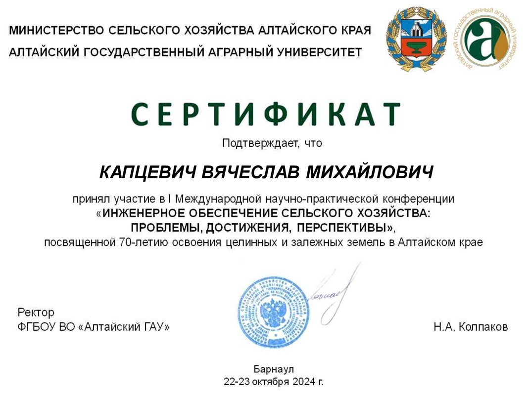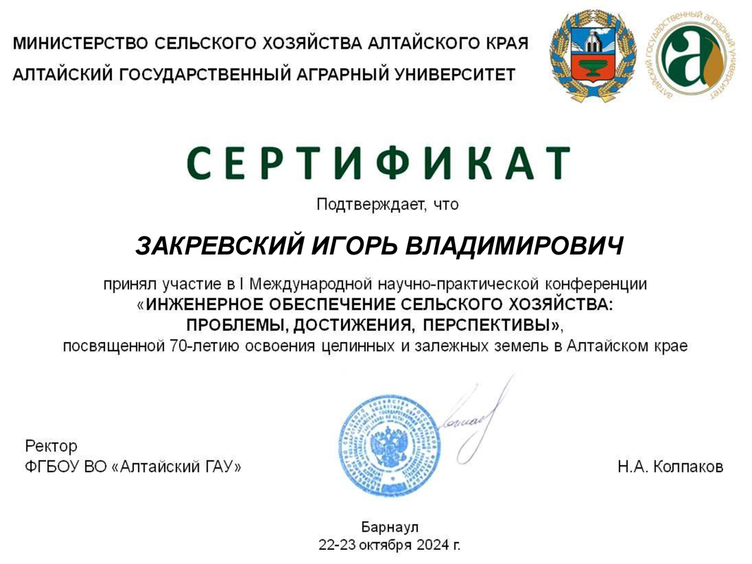 Сотрудники кафедры приняли участие в I Международной научно-практической конференции «Инженерное обеспечение сельского хозяйства: проблемы, достижения, перспективы», посвящённой 70-летию освоения целинных и залежных земель в Алтайском крае.
