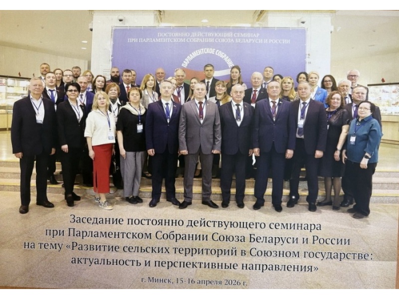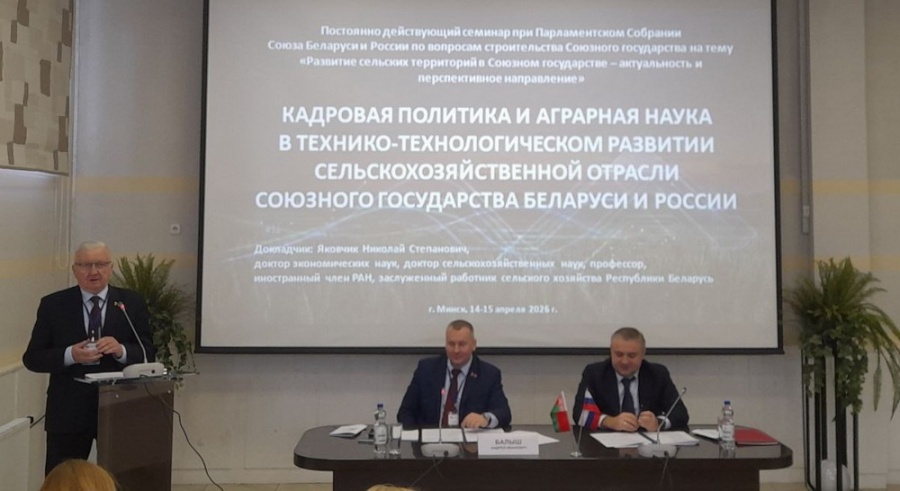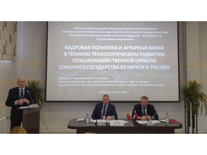 15-16 апреля 2026 года в г. Минске прошло заседание постоянно действующего семинара при Парламентском Собрании Союза Беларуси и России по вопросам строительства Союзного государства на тему «Развитие сельских территорий в Союзном государстве: актуальность и перспективные направления». В семинаре принимали участие члены и депутаты палат Национального собранияРеспублики Беларусь и Федерального Собрания Российской Федерации, ответственные должностные лица Постоянного Комитета Союзного государства, представители профильных министерств и ведомств, научно-исследовательских и образовательных учреждений и организаций, а также представители агропредприятий. От Белорусского государственного аграрного технического университета в форуме принял участие Н. С. Яковчик, директор Института повышения квалификации и переподготовки кадров АПК БГАТУ, доктор экономических наук, доктор сельскохозяйственных наук, профессор, иностранный член РАН, заслуженный работник сельского хозяйства Республики Беларусь. Николай Степанович представил доклад на тему «Кадровая политика и аграрная наука в технико-технологическом развитии сельскохозяйственной отрасли Союзного государства Беларуси и России».
