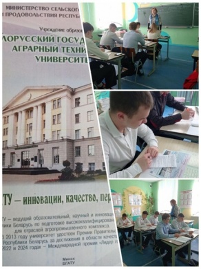 Для лучшего усвоения знаний в качестве иллюстраций к ответам Наталья Петровна использовала плакаты студентов БГАТУ – участников выставки ко Дню Конституции Республики Беларусь, состоявшей в нашем университете 14 марта 2019 года, и рассказала, что учиться в БГАТУ очень увлекательно и занимательно. Школьники задавали и вопросы о профориентации. Наталья Петровна показала презентацию о БГАТУ и обратила внимание на особенности поступления и интересные моменты обучения в нашем университете. Обсуждение темы вызвало живой интерес и отклик у школьников, ведь это поможет им определиться с выбором кем они хотят стать.
