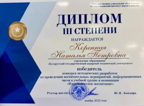 Лауреат Республиканского конкурса, посвященного Году науки, в номинации лучшая научная разработка «Доктрина национальной продовольственной безопасности Республики Беларусь до 2030 года».