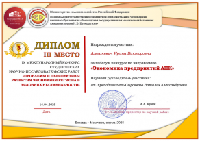 Поздравляем студентов-менеджеров и их руководителей в победе в IX Международном конкурсе студенческих научно-исследовательских работ "Проблемы и перспективы развития экономического региона в условиях" ФГБОУ ВО Вологодская ГМХА имени Н. В. Верещагина
