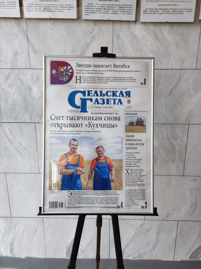 20 сентября 2023 года в БГАТУ открылась выставка "Уборка хлеба – дело всенародное". Так уж повелось, что журналисты всегда в центре важных событий. Фотографируют, пишут, показывают и рассказывают со страниц газет и в сюжетах телевидения о самом главном. Передовики жатвы – герои настоящего времени. И в сезон горячей поры мы говорим о них действительно много. Ведь как сказал Глава нашего государства, они достойны того, чтобы на них равнялись, чтобы ими гордилась вся страна. Приглашаем посетить выставку! Выставка расположена в УЛК1, 2 этаж.