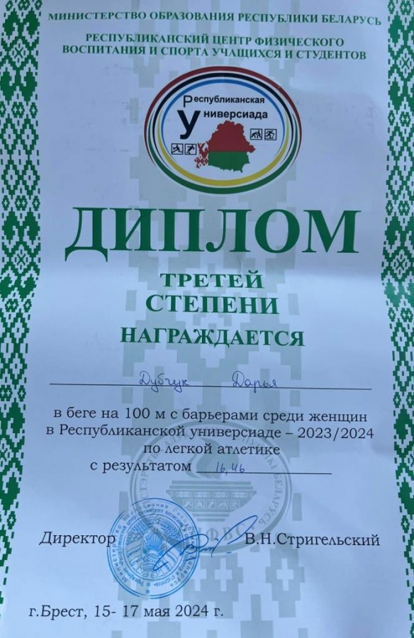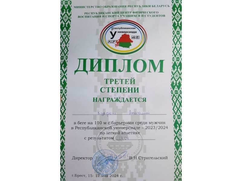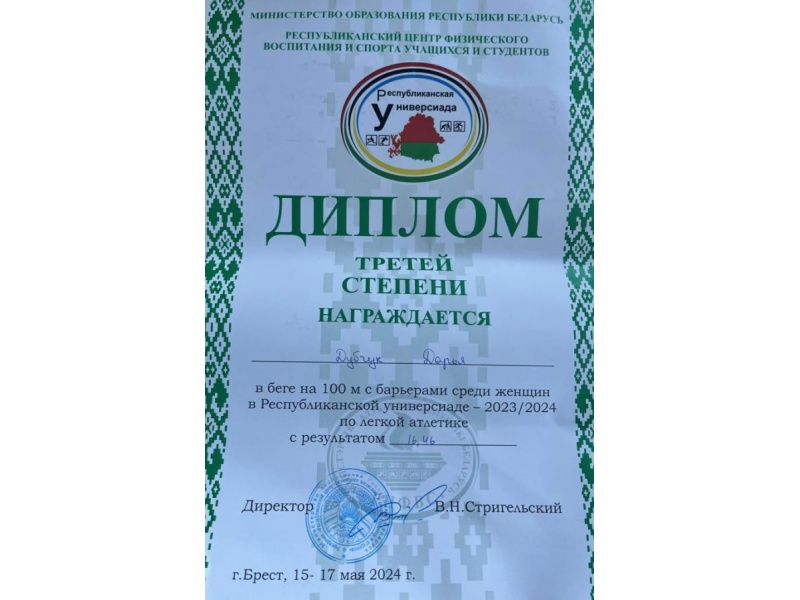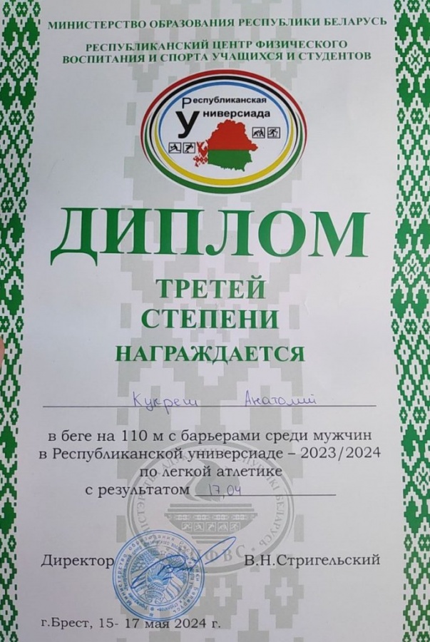 С 15 по 17 мая в г.Бресте прошла Республиканская универсиада по Легкой атлетике в которой приняли участие наши студенты. Студент (АМФ, гр.12 т) Самосюк Андрей завоевал серебряную медаль в метании копья с результатом 61 метр 56 сантиметров, Анатолий Кукреш (ФТС, гр.51 тс) выиграл бронзовую медаль в беге на 110м с барьерами с результатом 17, 04 секунд. В беге на 100 метров с барьерами третьей финишировала и завоевала бронзовую медаль студентка (АМФ, 8 м группы) Дубчук Дарья. Поздравляем наших студентов и старшего преподавателя (Мастера спорта международного класса, МСМК по Легкой атлетике) Навицкого Игоря Антоновича с успешным выступлением на Республиканской универсиаде!