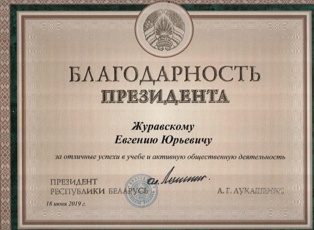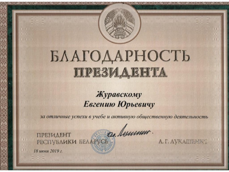 Студент БГАТУ Журавский Евгений среди лучших выпускников и преподавателей учреждений образования удостоен Благодарности Президента Республики Беларусь.