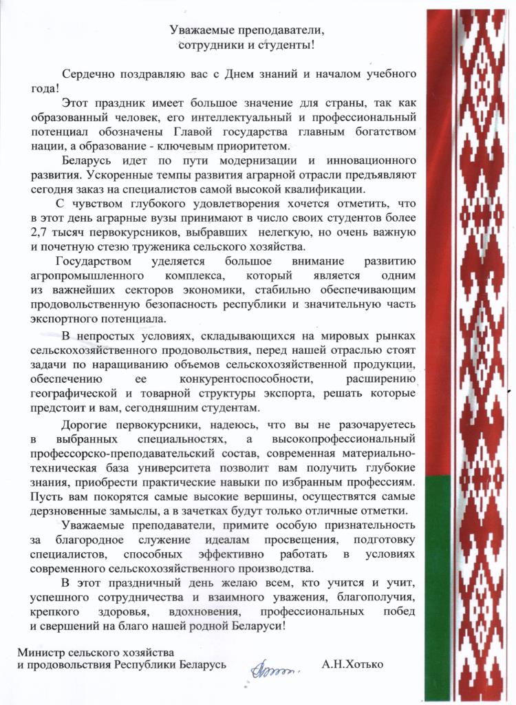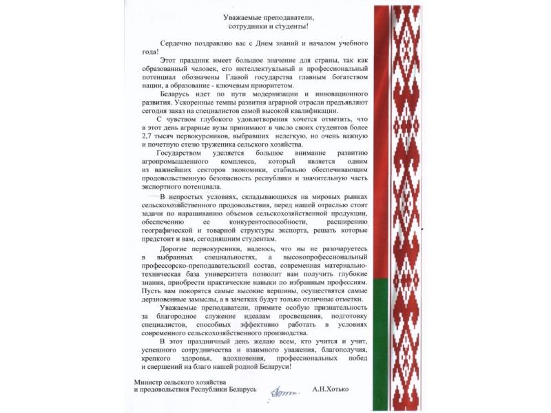 718 студентов 1-го курса пополнили студенческое братство БГАТУ. С приветственным словом к первокурсникам обратился Министр сельского хозяйства и продовольствия Республики Беларусь Хотько Анатолий Николаевич.