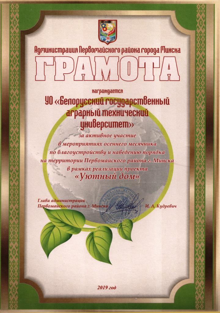 [node:title]04 ноября 2019 года на заседании администрации Первомайского района г. Минска волонтёры БГАТУ приняли участие в подведении итогов участия учреждений образования и организаций в проекте «Уютный дом» по благоустройству и наведению порядка на территории Первомайского района г. Минска. Студенты БГАТУ активно приняли участие в данном проекте, оказав содействие коммунальным службам, УП «Зеленстрой Первомайского района г. Минска» в уборке территории Парка им. Челюскинцев, бульвара Толбухина, ул.Кедышко - ул.Кнорина и территории.
