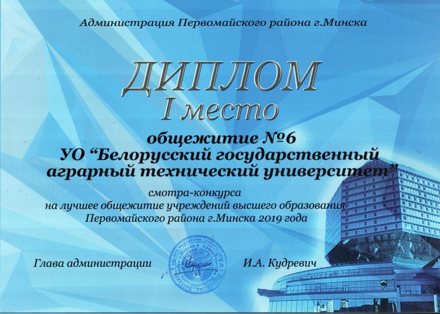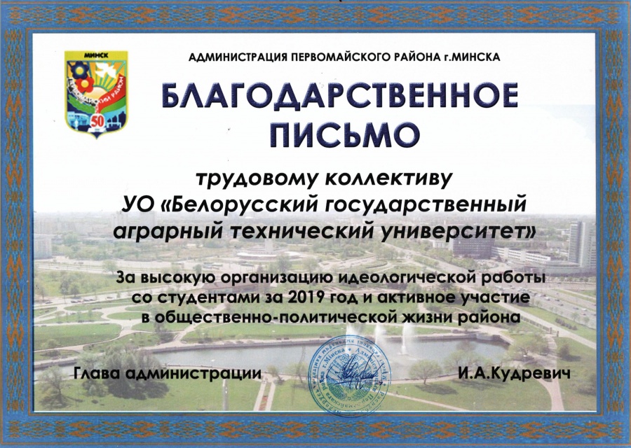 [node:title]18 декабря 2019 года на базе ОАО "Белэнергоремналадка" в рамках районного семинара подведены итоги организации идеологической работы со студентами за 2019 год и активное участие в общественно-политической жизни района, определены задачи по повышению ее эффективности в 2020 году и пути сотрудничества в современных условиях. Общежитие №6 БГАТУ награждено Дипломом 1 степени по итогам смотра-конкурса "Лучшее студенческое общежитие " Первомайского района г.Минска.