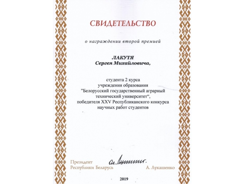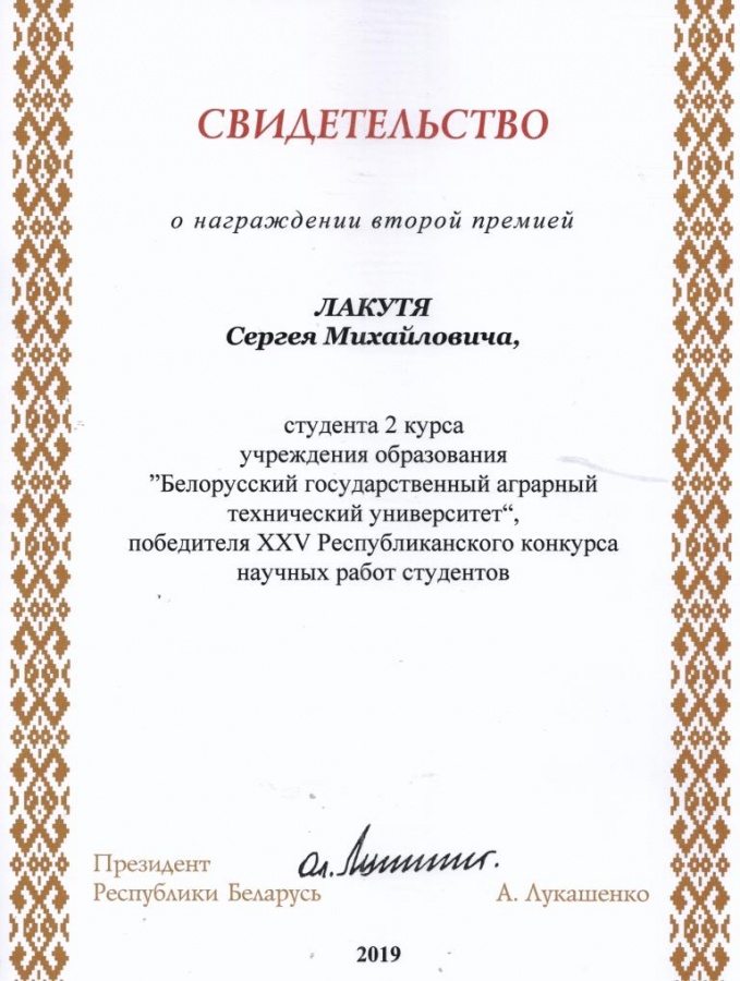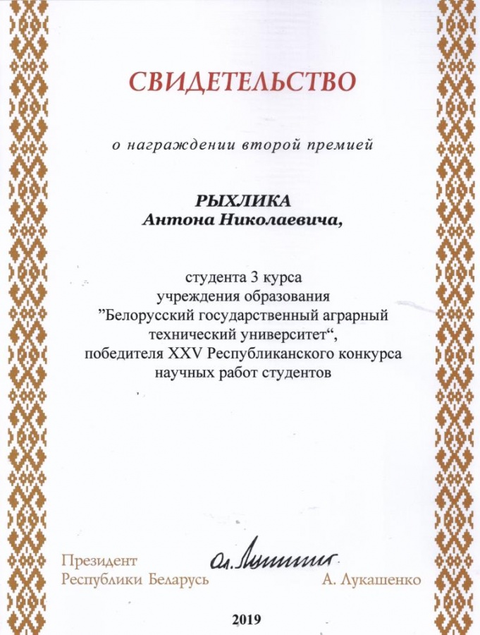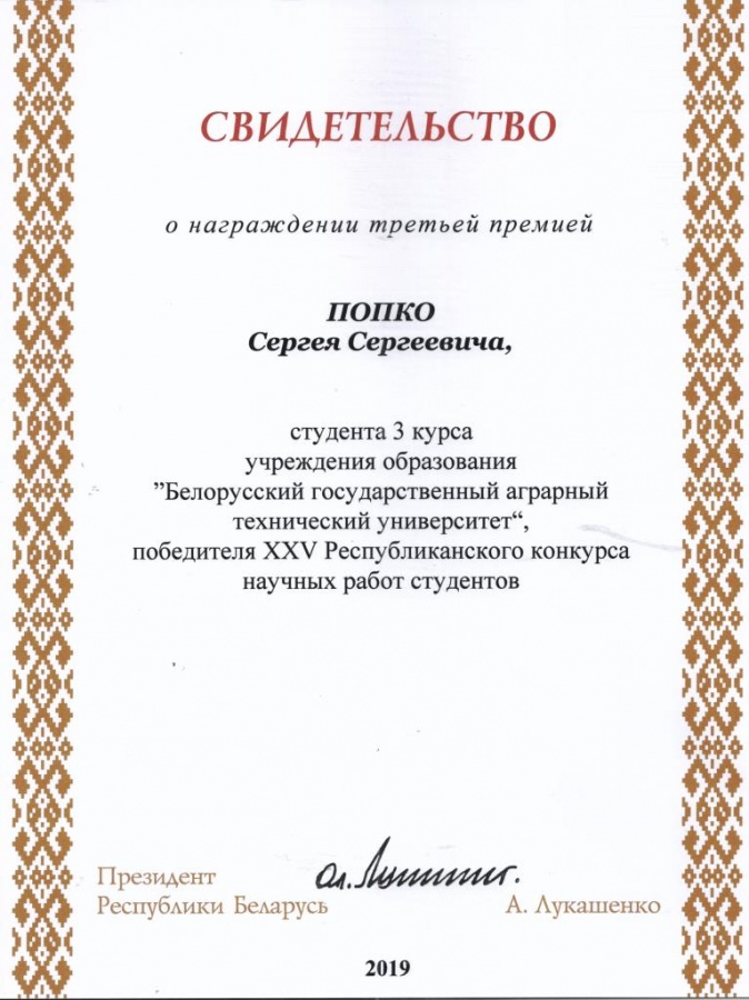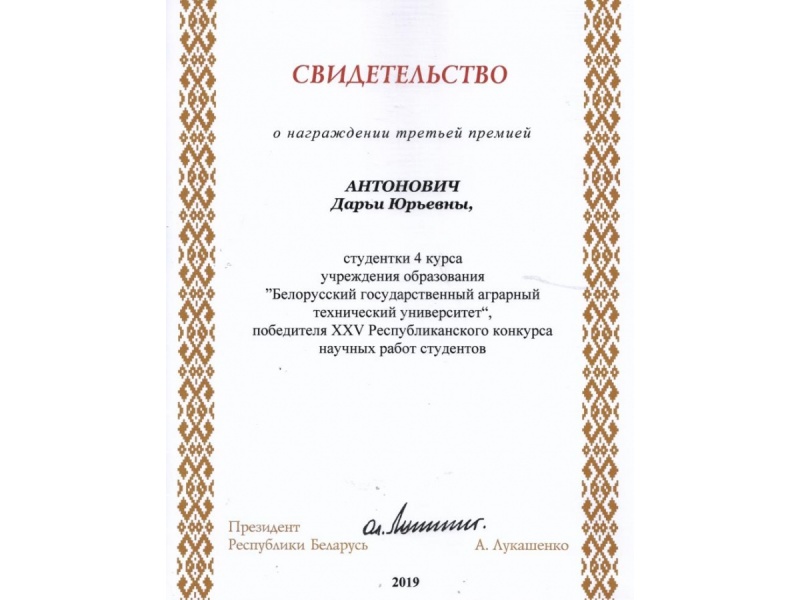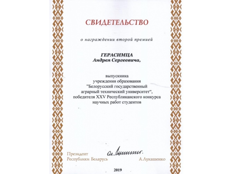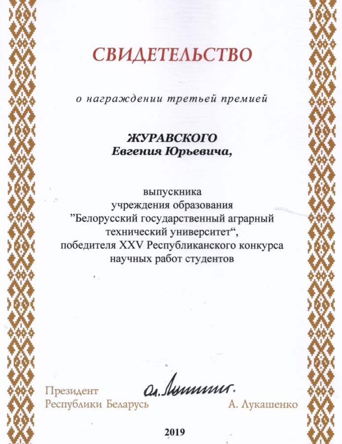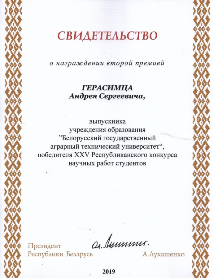 По результатам XXV Республиканского конкурса научных работ студентов Свидетельств специального фонда Президента Республики Беларусь  по социальной поддержке одаренных учащихся и студентов удостоены обучающиеся БГАТУ: