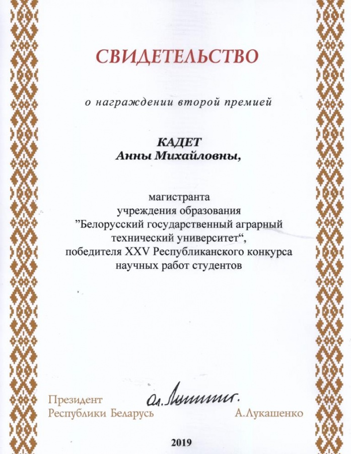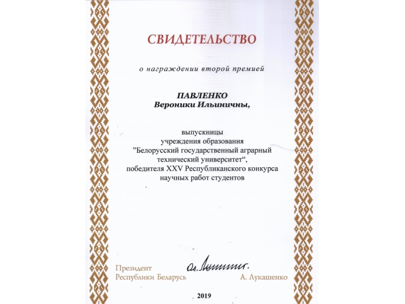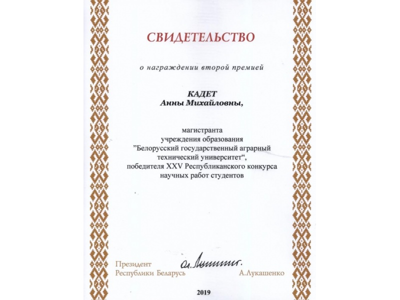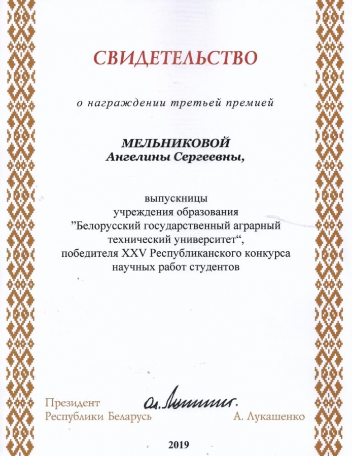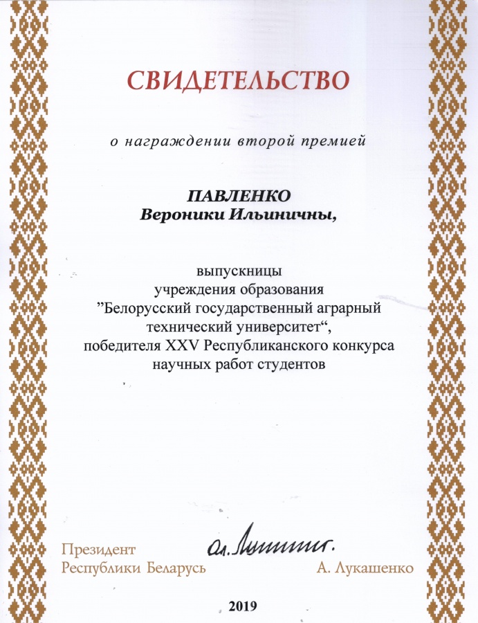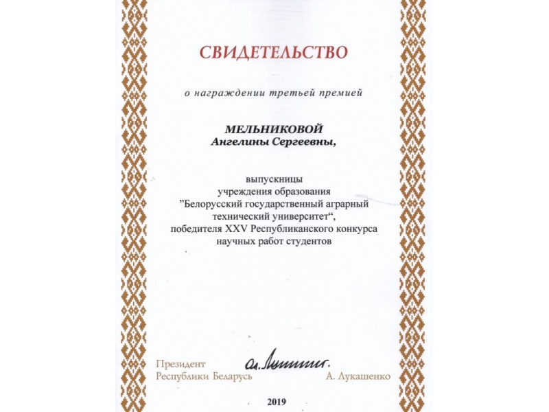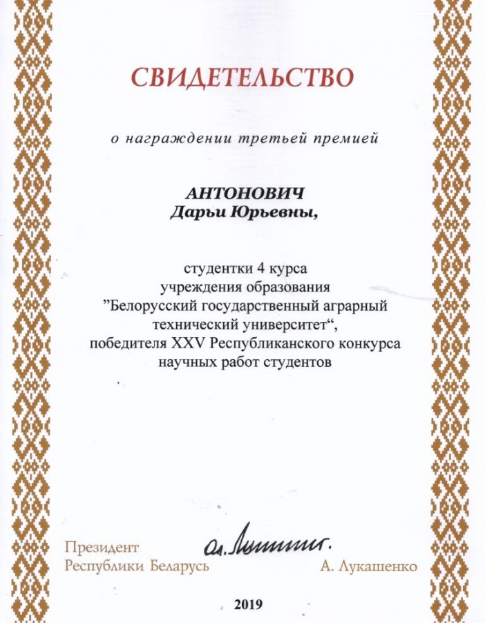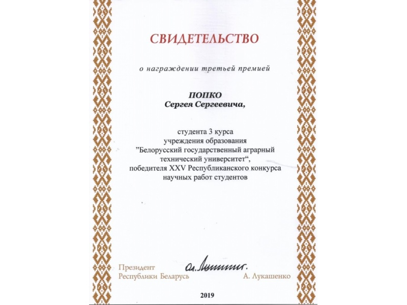 По результатам XXV Республиканского конкурса научных работ студентов Свидетельств специального фонда Президента Республики Беларусь  по социальной поддержке одаренных учащихся и студентов удостоены обучающиеся БГАТУ: