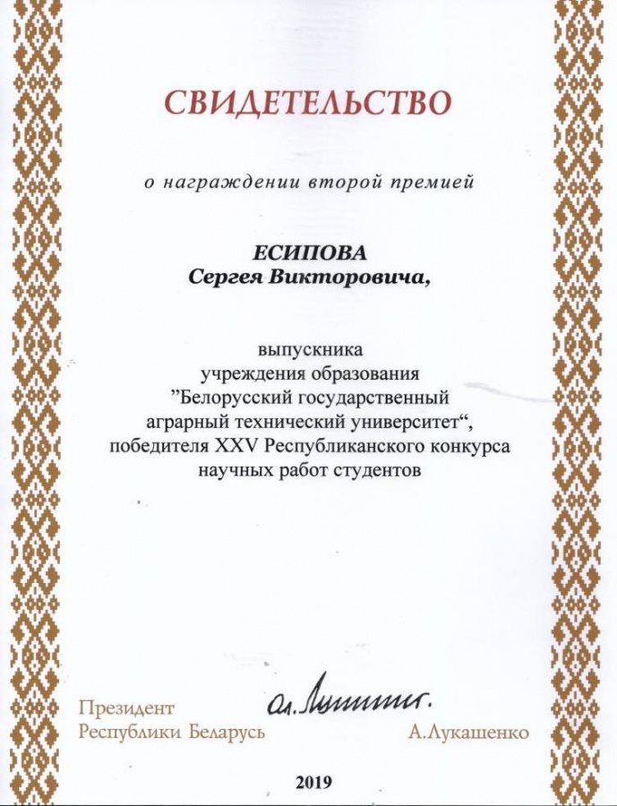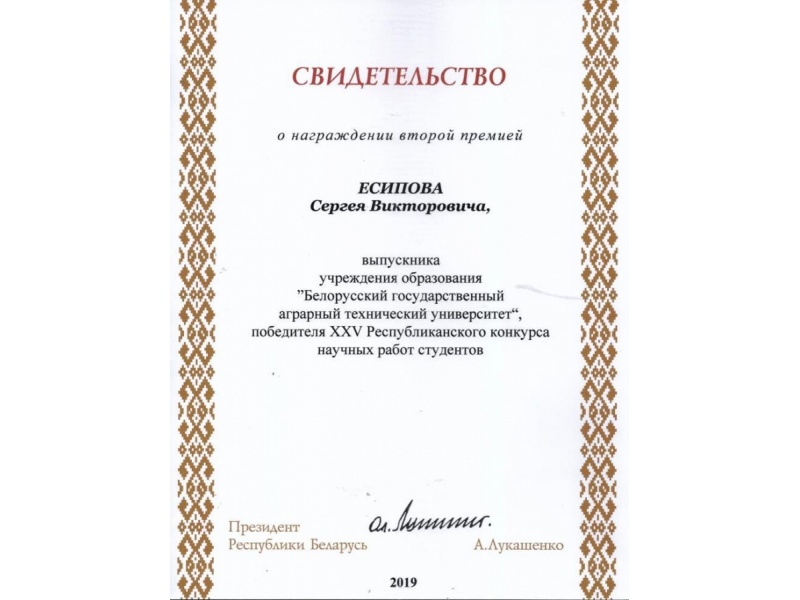 - Есипов Сергей - вторая премия за научную работу «Совершенствование машин и оборудования для послеуборочной доработки зерна», научный руководитель Романюк Н.Н., к.т.н., доцент, первый проректор БГАТУ;