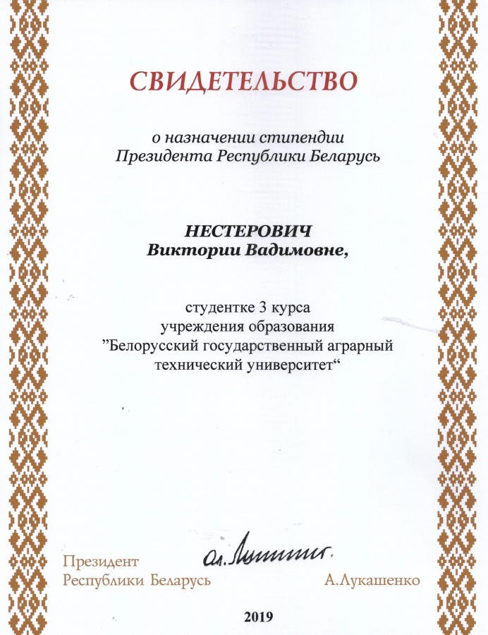 Свидетельством специального фонда Президента Республики Беларусь  по социальной поддержке одаренных учащихся и студентов о назначении стипендии Президента Республики Беларусь награждена Нестерович Виктория, студентка  3 курса 13 им группы факультета предпринимательства и управления, куратор  Быкова Е.Ю., преподаватель кафедры менеджмента и маркетинга.