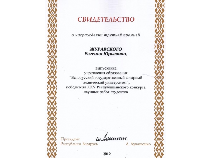 - Журавский Евгений - третья премия за научную работу «Размерно-массовые характеристики корнеплодов моркови, как основание для выбора параметров сортировальных поверхностей», научный руководитель Радишевский Г.А., к.т.н., доцент кафедры с/х машин;