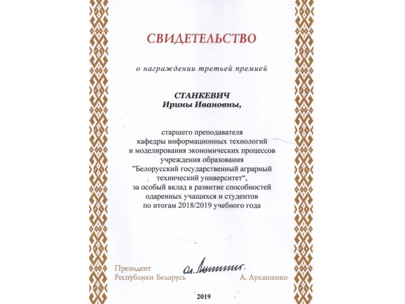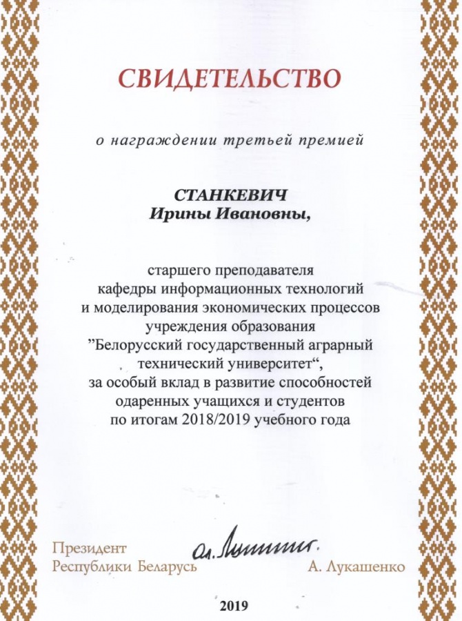 Специальным фондом Президента Республики Беларусь по социальной поддержке одаренных учащихся и студентов по итогам 2018-2019 учебного года за личный вклад в работу с обучающимися и студентами, развитие способностей одаренной молодежи в области образования, науки, техники и передовых технологий, разработку современных методик её воспитания и обучения награждена третьей премией старший преподаватель кафедры информационных технологий и моделирования экономических процессов Станкевич Ирина Ивановна.