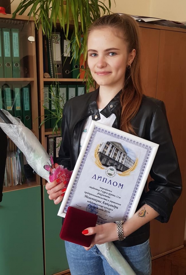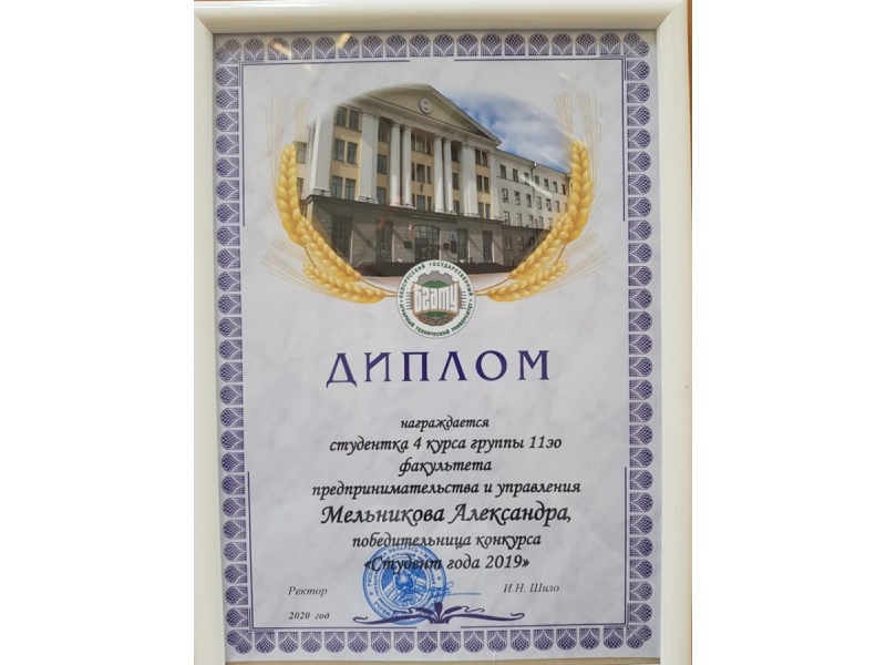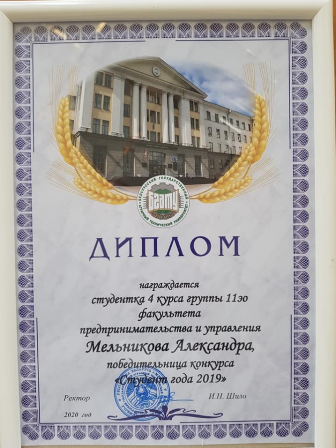 «Студент года 2019» - Мельникова Александра, студентка 4 курса факультета предпринимательства и управления. 04 июня 2020 года при поддержке профсоюзного комитета студентов состоялось награждение победителя конкурса. Александра по праву заслужила эту награду. Кроме отличной учебы студентка может похвастаться активным участием в общественной жизни университета. На городском этапе Республиканского конкурса «100 идей для Беларуси» ее проект «Экономическая эффективность переработки картофеля и пути ее повышения в Республике Беларусь» был признан одним из наиболее перспективных. В 2018 году Александра включена в Республиканский банк одаренной молодежи. Поздравляем Александру с победой и желаем дальнейших успехов!