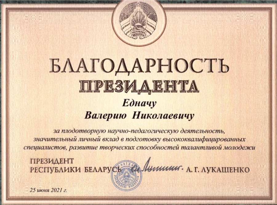 Поздравляем Еднача Валерия Николаевича, доцента кафедры сельскохозяйственных машин, удостоенного Благодарности Президента "за плодотворную научно-педагогическую деятельность, значительный вклад в подготовку высококвалифицированных специалистов, развитие творческих способностей талантливой молодежи".