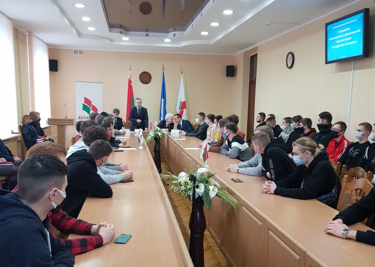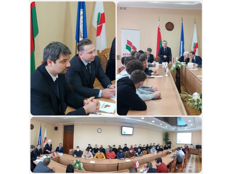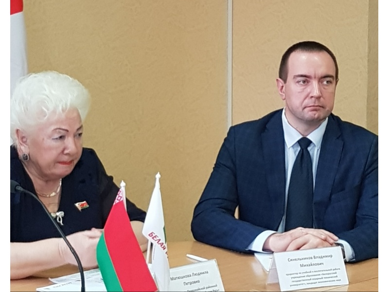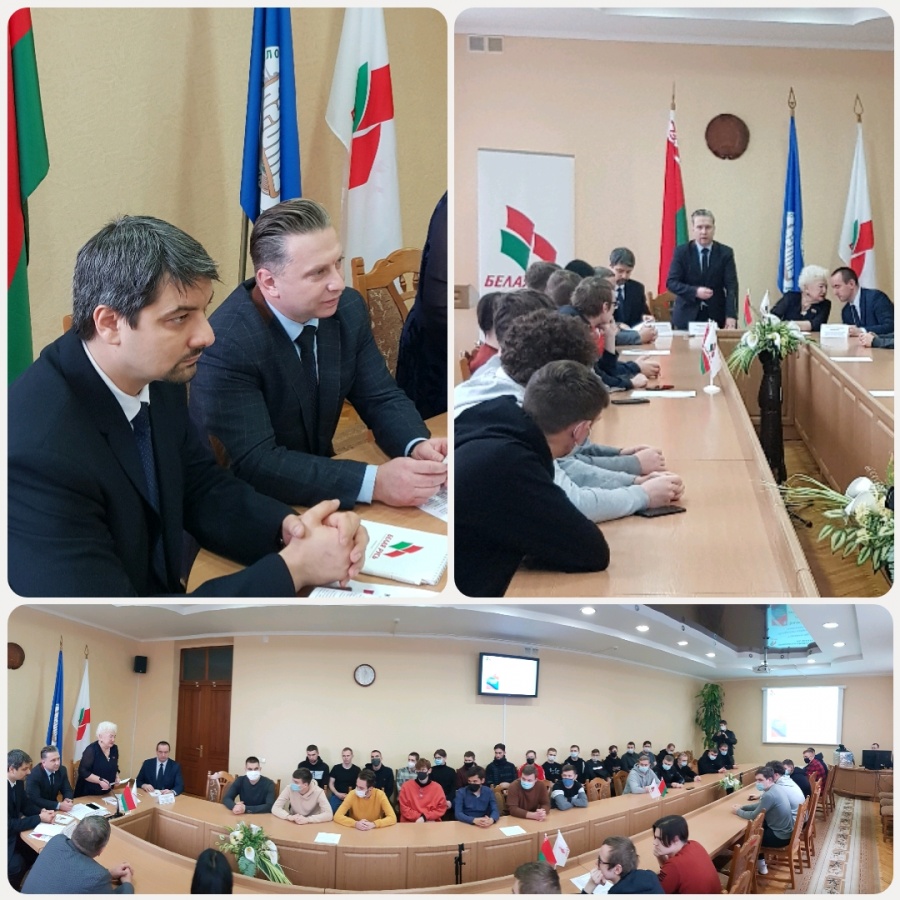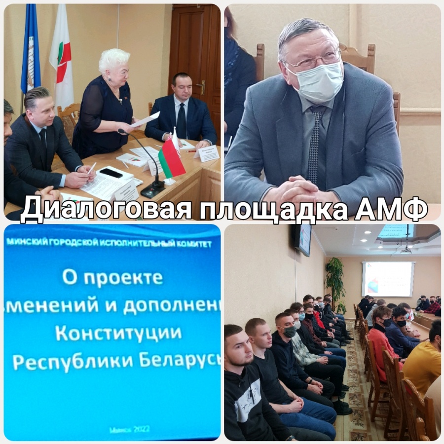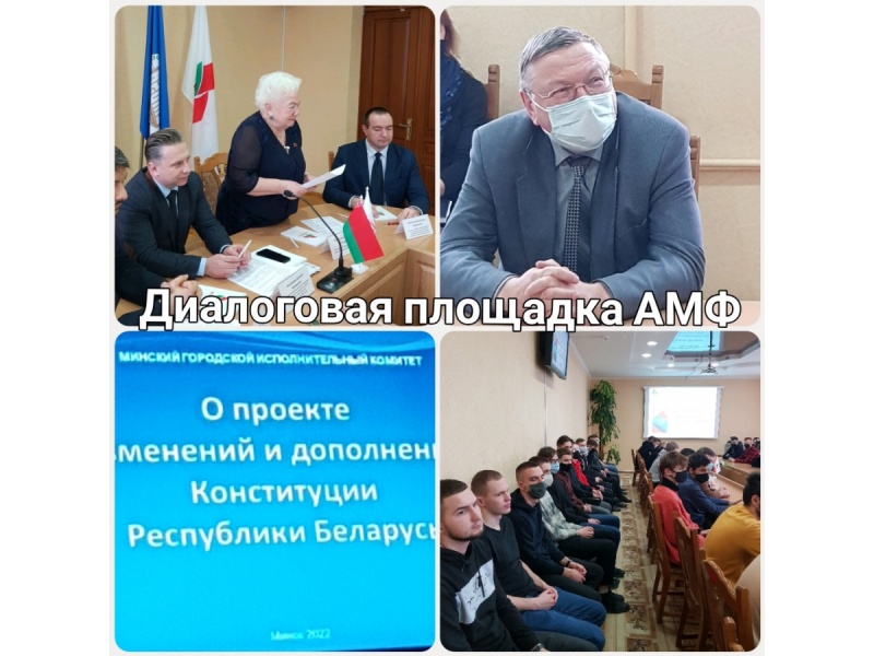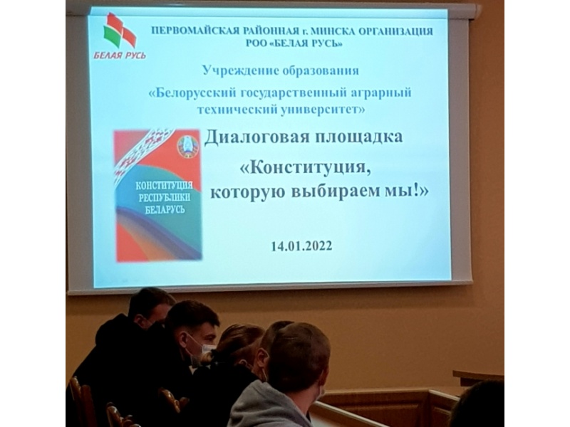 14 января 2022 года в Белорусском государственном аграрном техническом университете прошла диалоговая площадка "Конституция, которую выбираем мы!". Модератором мероприятия выступила председатель Первомайской районной г. Минска организации РОО "Белая Русь" Матюшкова Л.П., спикеры: заместитель заведующего отделом правовой, аналитической и методической работы Центральной комиссии Республики Беларусь по выборам и проведению республиканских референдумов Толкач И.А., первый проректор БГАТУ Миранович А.В., проректор по учебной и воспитательной работе Синельников В.М., а также декан агромеханического факультета Ловкис В.Б, заместители декана, кураторы и студенты агромехнического факультета.