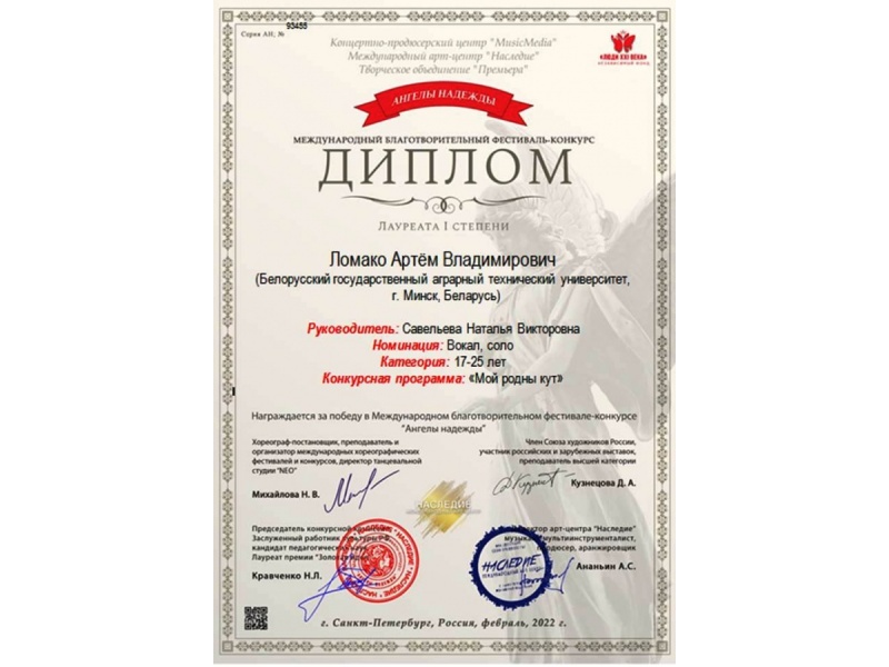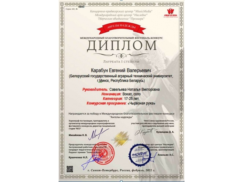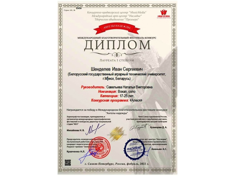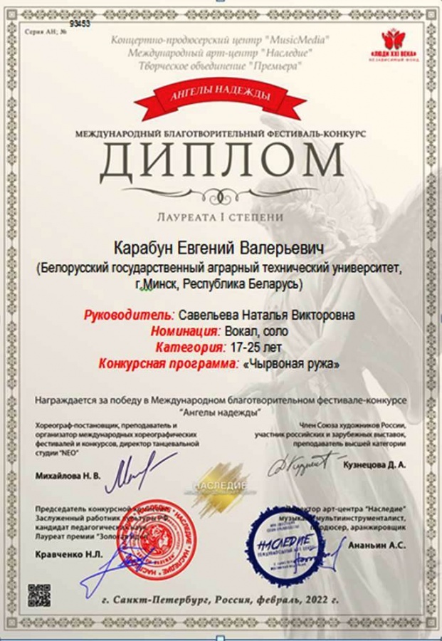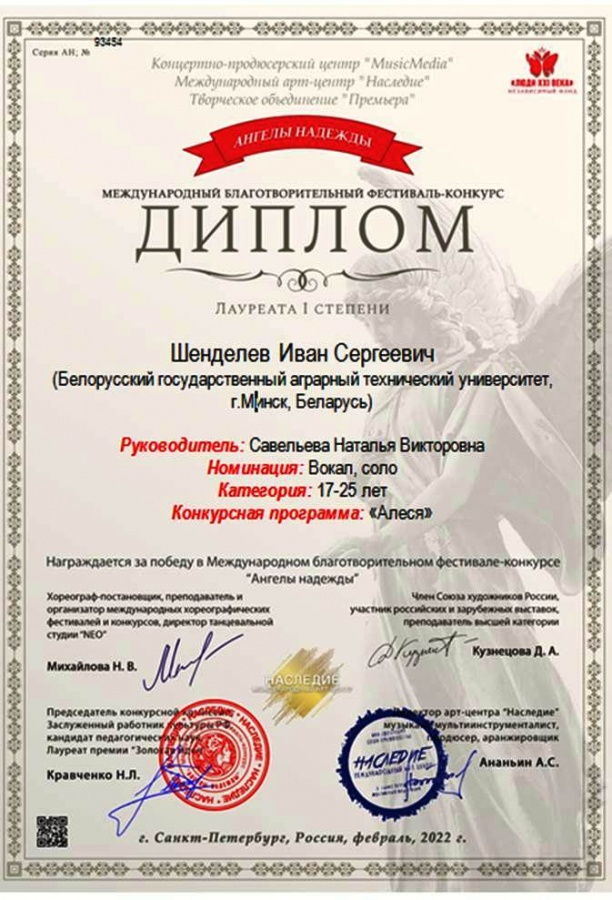 В феврале 2022 года студенты БГАТУ приняли участие в конкурсной программе (заочная форма участия) международного благотворительного конкурса-фестиваля "Ангелы надежды". Поздравляем студентов агроэнергетического факультета с Дипломом лауреата I степени в номинации "Вокал, соло": Карабуна Евгения, Ломако Артема и Шенделева Ивана! Руководитель вокальной студии - Савельева Н.В.