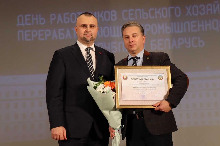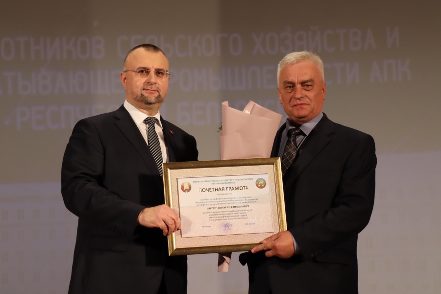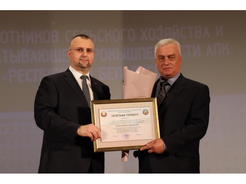 За многолетний научно-педагогический труд, значительный вклад в подготовку высококвалифицированных кадров для агропромышленного комплекса, Почетной грамотой Министерства сельского хозяйства и продовольствия Республики Беларусь награждены Миранович А.В., первый проректор и Китун А.В., профессор кафедры технологии механизации животноводства.