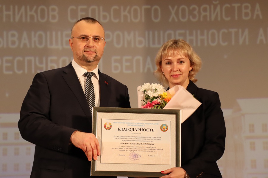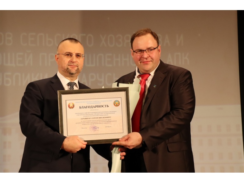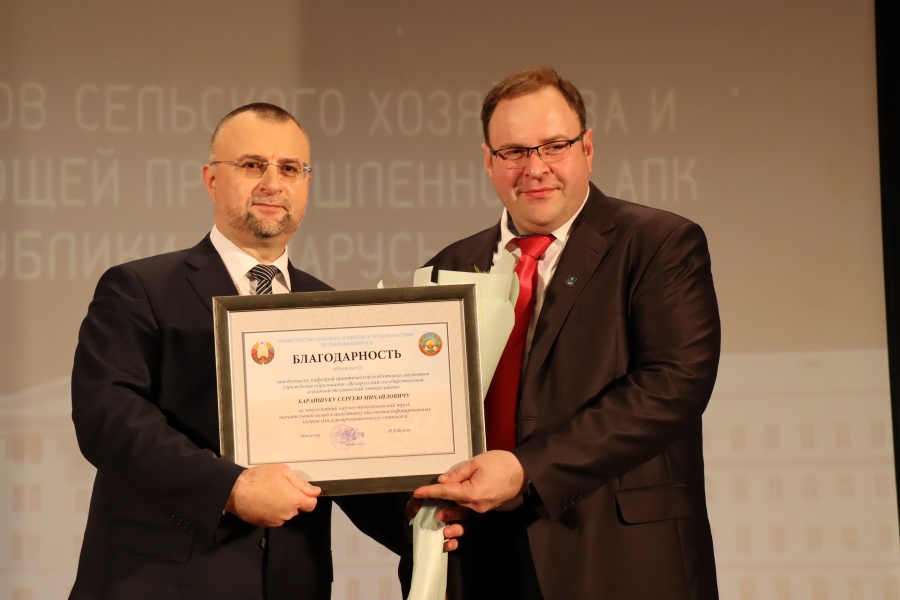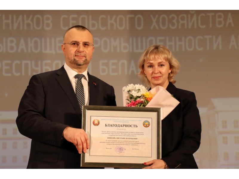 Объявлена Благодарность Министерства сельского хозяйства и продовольствия Республики Беларусь Барайшуку С.М., заведующему кафедрой практической подготовки студентов и Бондарь С.В., декану факультета предпринимательства и управления.