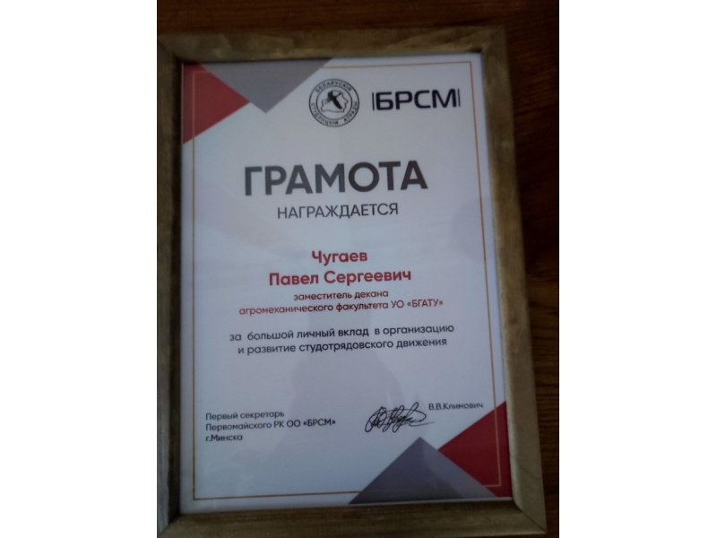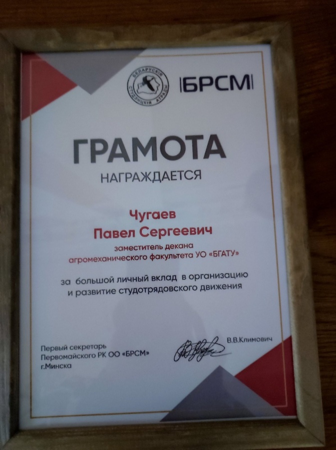 Роман Бондарук, первый секретарь Минского городского комитета БРСМ наградил лучших командиров и заместителей командиров студенческих отрядов БГАТУ:
