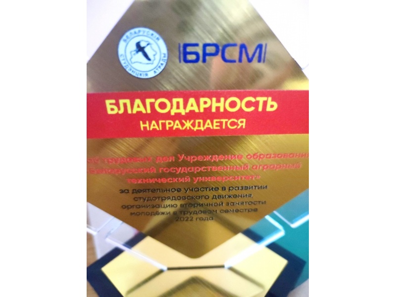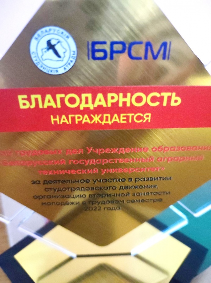 29 декабря 2022 года на базе учреждения образования "Белорусский государственный аграрный технический" университет состоялось торжественное закрытие третьего трудового семестра 2022, где были подведены итоги трудовой деятельности студенческих отрядов района и награждены лучшие отряды, командиры и участники, работавшие в 2022 году.