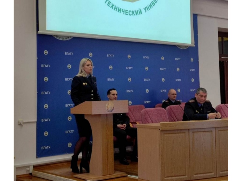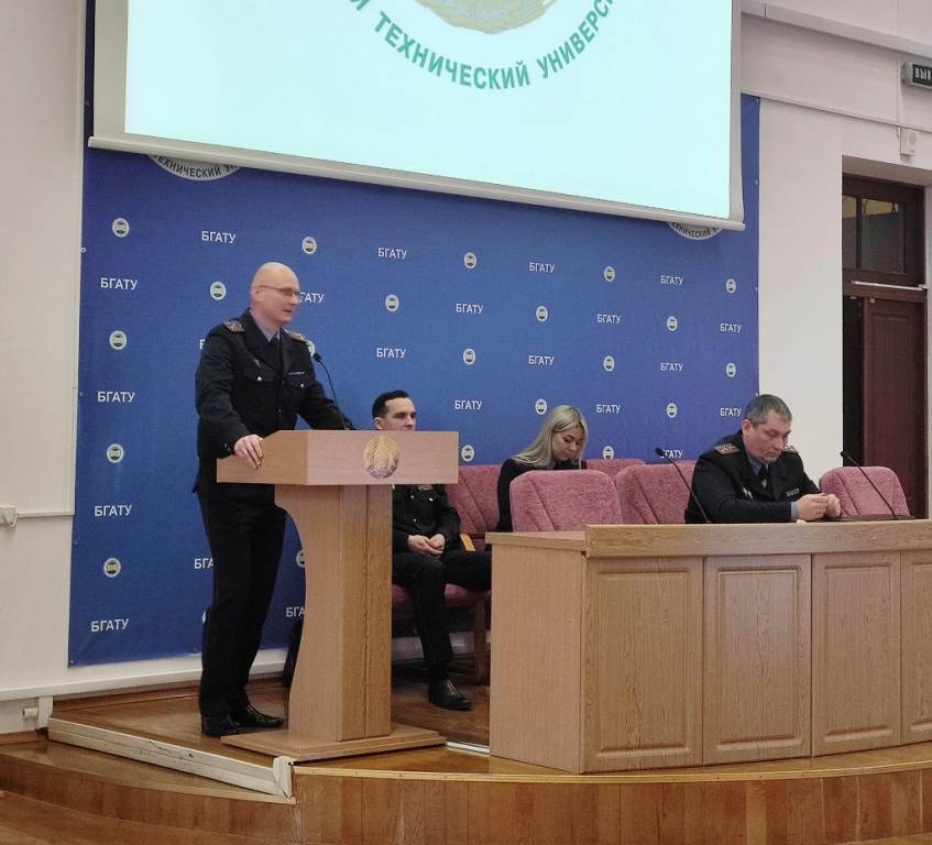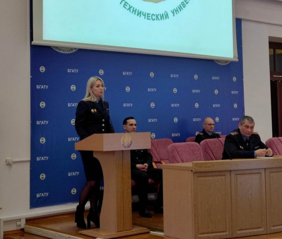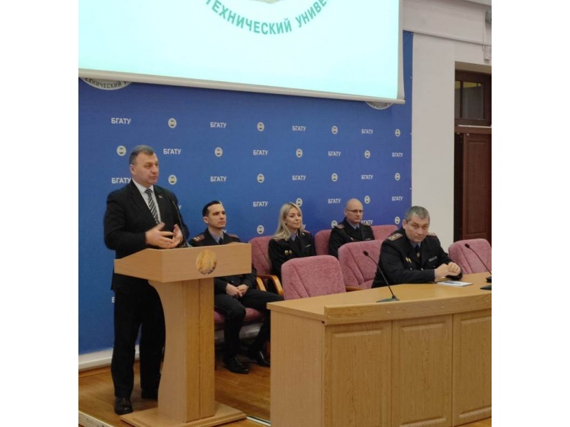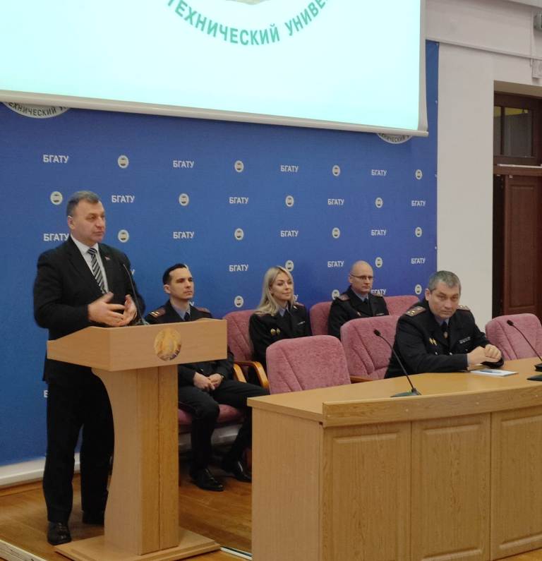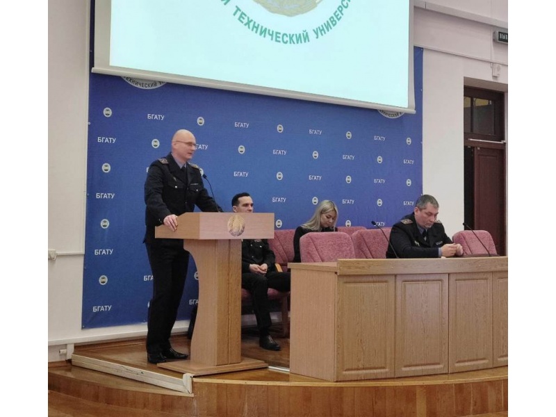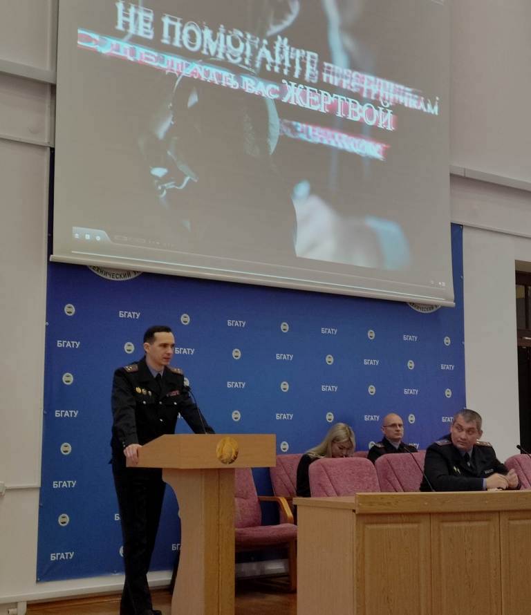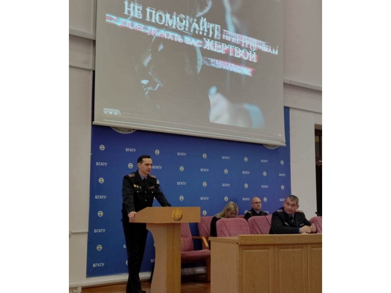 [node:title]26 января 2023 года в БГАТУ прошла диалоговая площадка на тему: «Основные аспекты профилактики киберпреступности в Республике Беларусь». Перед работниками и студентами выступили: заместитель начальника Мингорисполкома начальник криминальной милиции полковник милиции Гамола М.А, начальник отдела кадров ПК и ИР ГУВД Мингорисполкома полковник милиции Хотько Д.В., начальник УПК КМ ГУВД Мингорисполкома минской милиции Новаш А.В., начальник ОИОС ГУВД Мингорисполкома Ганусевич Н.Д.