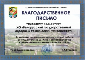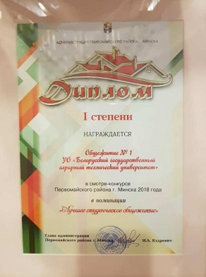 18 декабря 2019 года на базе ОАО "Белэнергоремналадка" в рамках районного семинара подведены итоги организации идеологической работы со студентами за 2019 год и активное участие в общественно-политической жизни района, определены задачи по повышению ее эффективности в 2020 году и пути сотрудничества в современных условиях. Общежитие №6 БГАТУ награждено Дипломом 1 степени по итогам смотра-конкурса "Лучшее студенческое общежитие " Первомайского района г.Минска.