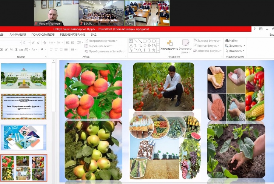 26.03.2026 для студентов специальности «Техническое обеспечение хранения и переработки сельскохозяйственной продукции» и преподавателей кафедры технологий и механизации животноводства и переработки сельскохозяйственной продукции состоялась онлайн-лекция старшего преподавателя кафедры переработки продуктов животноводства Туркменского сельскохозяйственного университета им. С.А. Ниязова Какабаевой Б.Ч. на тему «Переработка овощей и фруктов в Туркменистане».