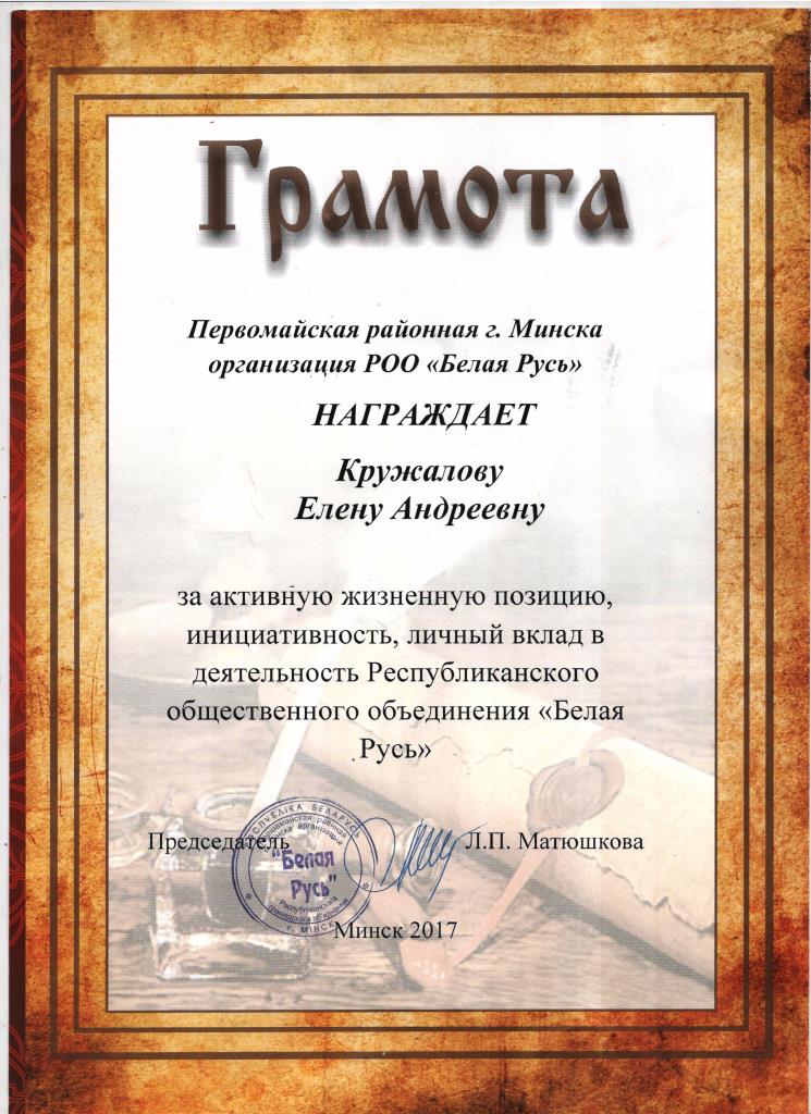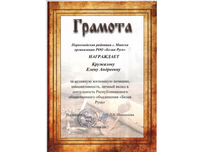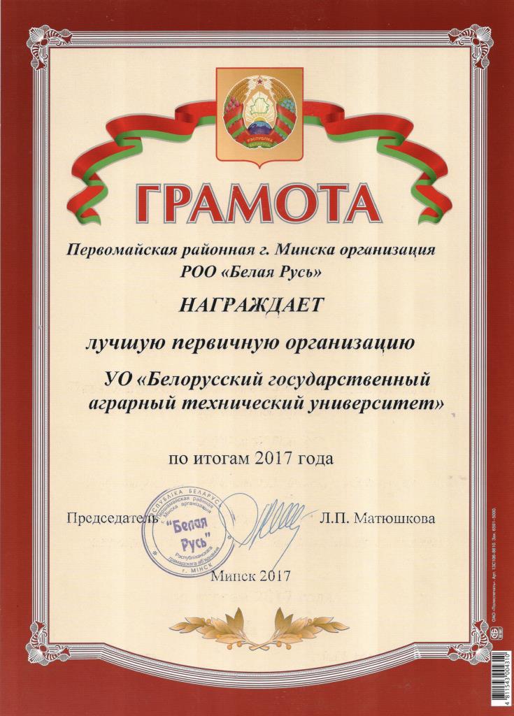 Пятидесятью новыми членами пополнились ряды Первомайской районной г. Минска организации РОО «Белая Русь», в том числе и пятью представителями БГАТУ. 21.12.2017 в актовом зале администрации Первомайского района г.Минска состоялась торжественная акция «В Новый год – с «Белой Русью». По итогам 2017 года самой многочисленной и активно принимающей участие в деятельности РОО «Белая Русь» признана первичная организация Белорусского государственного аграрного технического университета. Председателю первичной организации РОО «Белая Русь» БГАТУ Позднякову В.М. вручена Грамота Первомайской районной г.Минска организации РОО «Белая Русь».