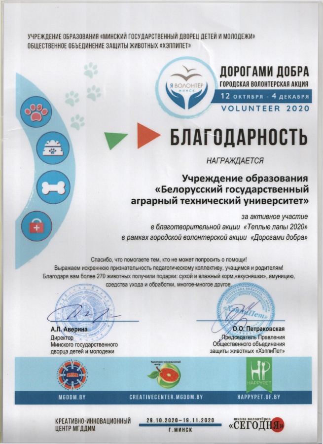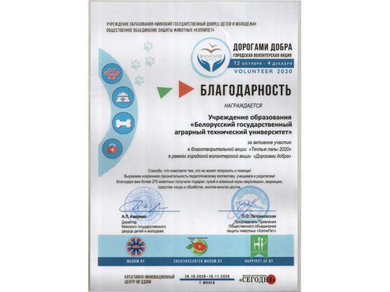 Наши волонтеры СОВА БГАТУ удостоены Благодарности Минского городского дворца детей и молодежи и председателя правления ОО ЗХ "ХаппиПет" за активное участие в городской волонтерской акции "Дорогами добра".