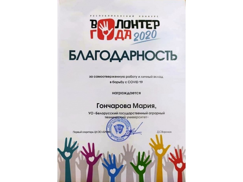 В начале декабря в Минске состоялось подведение итогов Республиканского конкурса "Волонтёр года". Редактору студенческой газеты "БГАТУ сегодня" Гончаровой Марии, студентке факультета предпринимательства и управления, объявлена Благодарность за самоотверженную работу и личный вклад в борьбу с COVID 19.