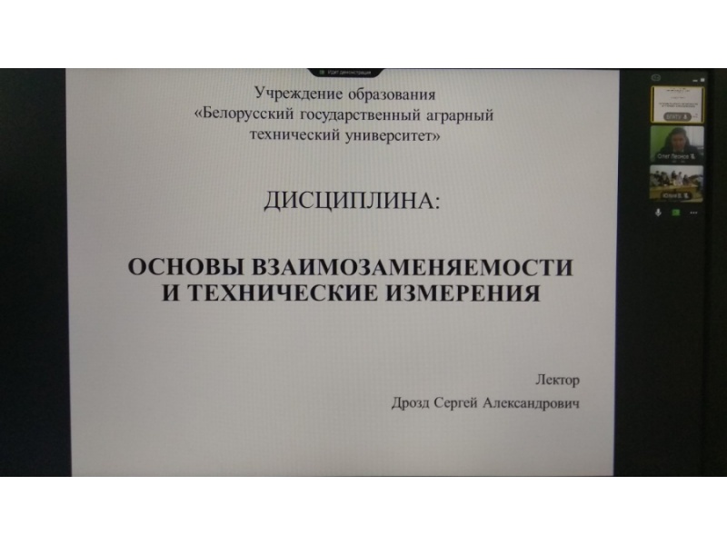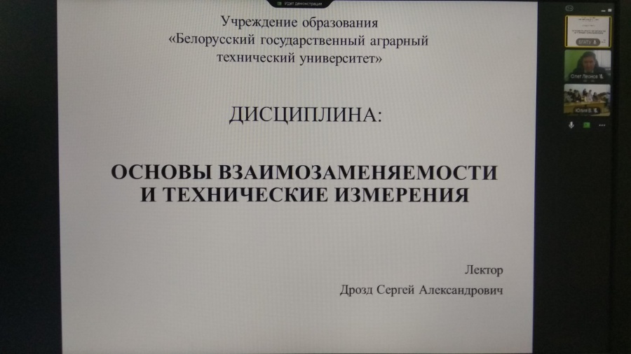 В рамках международного сотрудничества между кафедрой СМиИГ БГАТУ и кафедрой СМиУК ФГБОУ ВО «Российский государственный аграрный университет – МСХА имени К.А. Тимирязева» 14.02.2024 заместитель декана, к.т.н. Дрозд Сергей Александрович начал чтение цикла онлайн-лекций по дисциплине “Основы взаимозаменяемости и технические измерения” для бакалавриата (1-36 12 01 Проектирование и производство сельскохохяйственной техники – 16 чел. (РБ), 35.03.06 Агроинженерия – 24 чел. (РФ), 27.03.02 Управление качеством – 5 чел. (РФ).