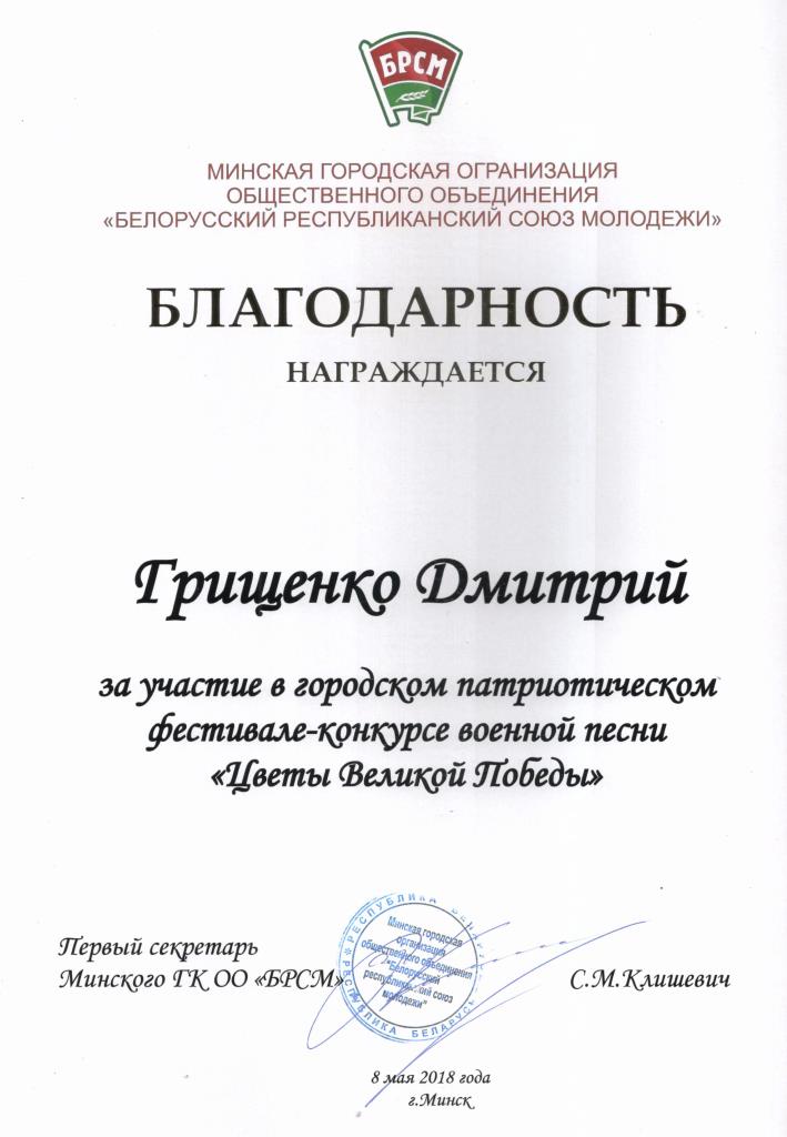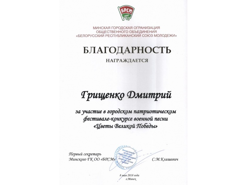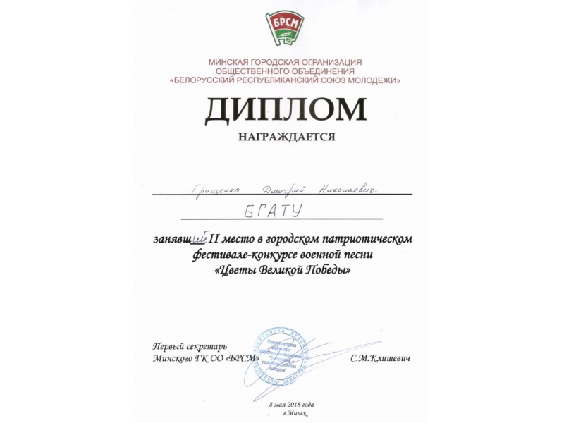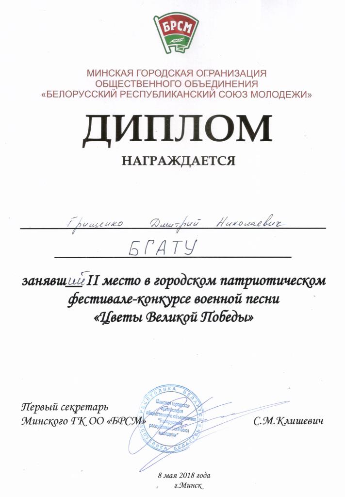 8 мая 2018 года активисты ПО ОО "БРСМ" с правами РК БГАТУ приняли участие в Городском патриотическом фестивале-конкурсе военной песни "Цветы Великой Победы". В творческой части конкурса БГАТУ представил Дмитрий Грищенко и стал дипломантом II степени. Поздравляем!