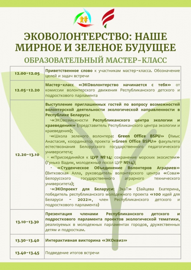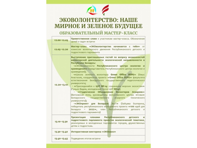 [node:title]5 апреля 2023 года в Национальном центре художественного творчества детей и молодежи Министерства образования Республики Беларусь состоялся образовательный мастер-класс "Эковолонтерство: наше мирное и зеленое будущее" в формате онлайн. В качестве экспертов по вопросу возможностей волонтерской деятельности экологической направленности в Республике Беларусь были приглашены представители Белорусского государственного аграрного технического университета. Координатор волонтерского центра БГАТУ Алла Витковская представила экологические, информационно-просветительские проекты, которые реализуются студентами университета. Рассказала об их актуальности, значимости в формировании нравственной и гражданской ответственности за экологическое состояние окружающей среды, воспитание осознанного, экологически целесообразного отношения к природе. Активист волонтёрского движения, студентка факультета предпринимательства и управления Дарья Галыгина подробно остановилась на одном из эковолонтерских проектов "Меньше еды - легче планете". Рассказала как влияют пищевые отходы на окружающую среду и дала советы как научиться не выбрасывать продукты питания. Доклады получили много положительных откликов и поступили предложения о сотрудничестве.