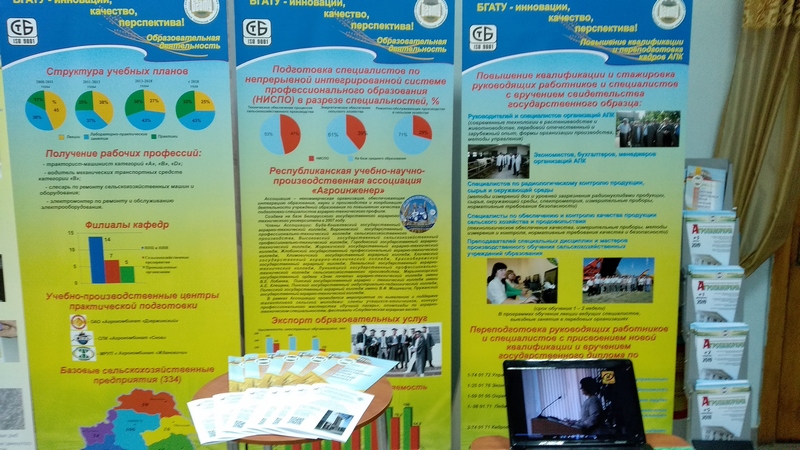 На экспозиции была представлена информация о подготовке студентов, переводготовке и повышении квалификации кадров АПК, подготовке научных работников высшей квалификации, научно-исследовательской работе, а также учебно-методические и научные труды работников и ученых БГАТУ.
