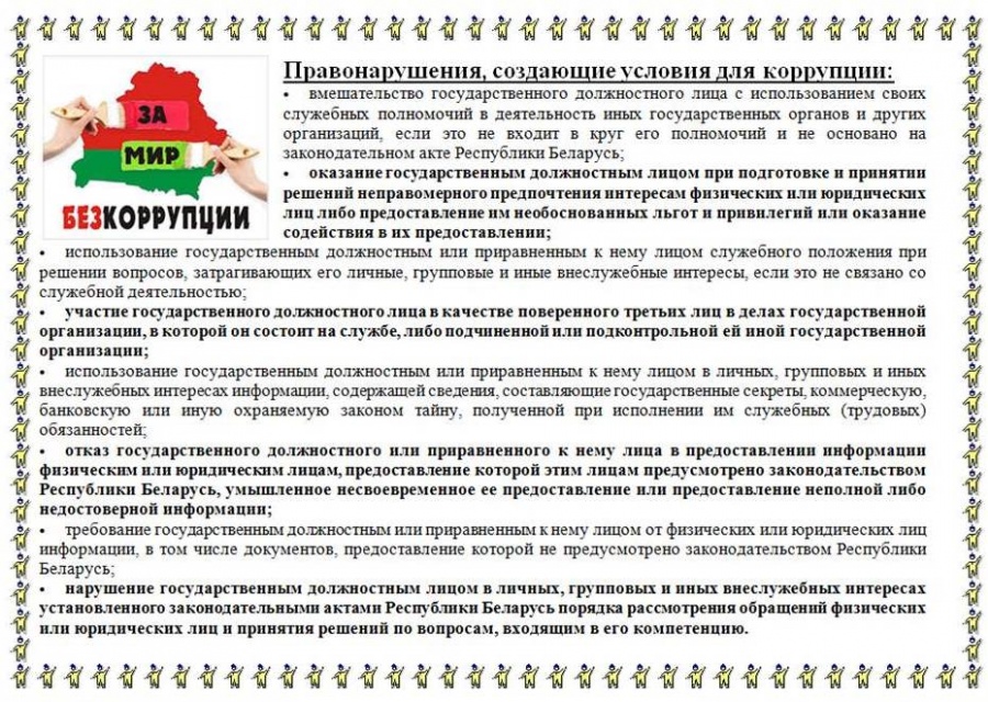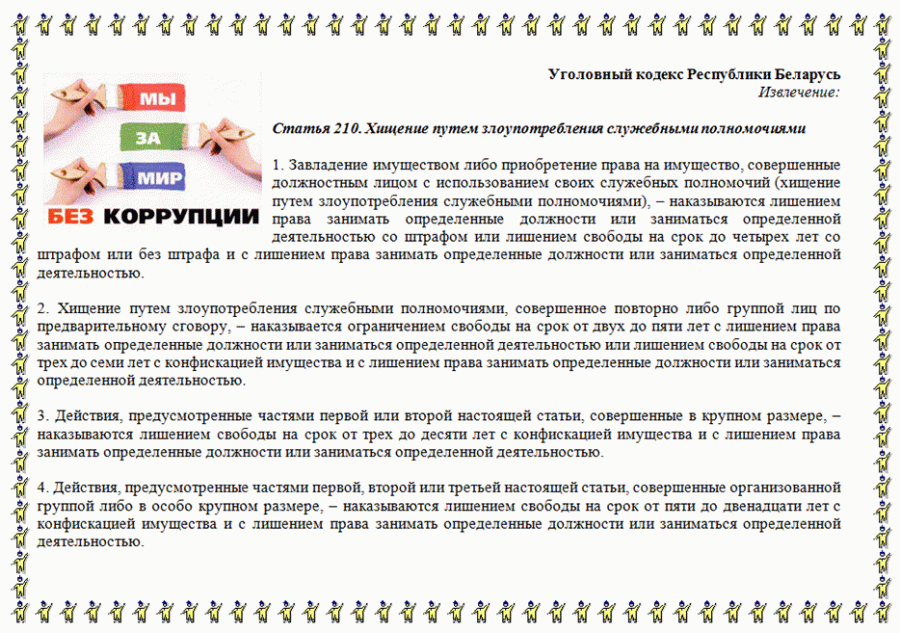 Справочно. К государственным органам и иным организациям, участвующим в борьбе с коррупцией, относятся Следственный комитет, органы Комитета государственного контроля, Государственный таможенный комитет и таможни, Государственный пограничный комитет и иные органы пограничной службы, Министерство по налогам и сборам и его инспекции, Министерство финансов и его территориальные органы, Национальный банк, другие банки и небанковские кредитно-финансовые организации. Другие государственные органы и иные организации также участвуют в борьбе с коррупцией в пределах своей компетенции в соответствии с актами законодательства. Общественные объединения участвуют в борьбе с коррупцией в соответствии с Законом о борьбе с коррупцией и иными актами законодательства.