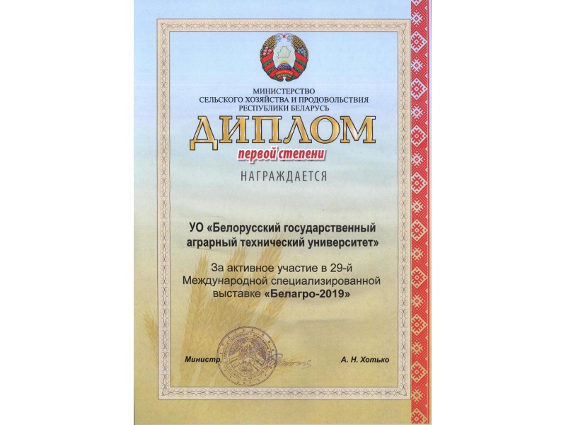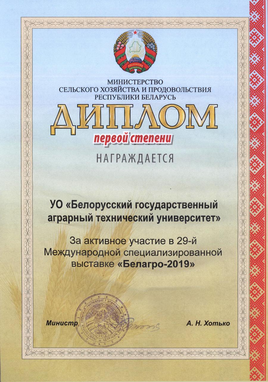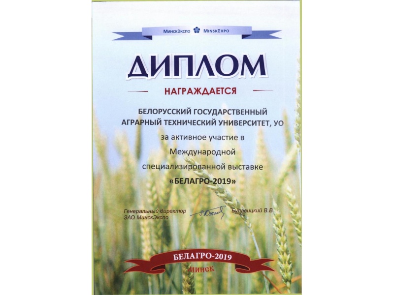 С 04 по 09 июня 2019 года Белорусский государственный аграрный технический университет принял участие в 29-й Международной специализированной выставке «Белагро-2019». На стенде университета была представлена информация о научно-исследовательской работе и научных разработках БГАТУ, натурные образцы упрочненных деталей рабочих органов сельскохозяйственных машин, литература (монографии, учебники, справочники, методики и т.д.), Стенд БГАТУ посетили более 500 человек, в том числе представительная делегация из Дятловского района Гродненской области, в составе директоров сельскохозяйственных предприятий ОАО «Гранит-Агро», КСУП «Жуковщина», КСУП «Войневичи», КСУП «Дворец-Агро» и КСУП «Вензовец». Достигнута предварительная договоренность о внедрении в вышеуказанных предприятиях программного комплекса автоматизированного рабочего места (АРМ) специалиста сельского хозяйства и обучении специалистов на базе ИПК и ПК АПК БГАТУ.