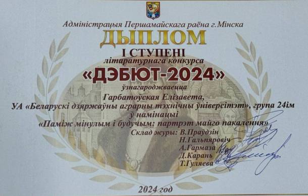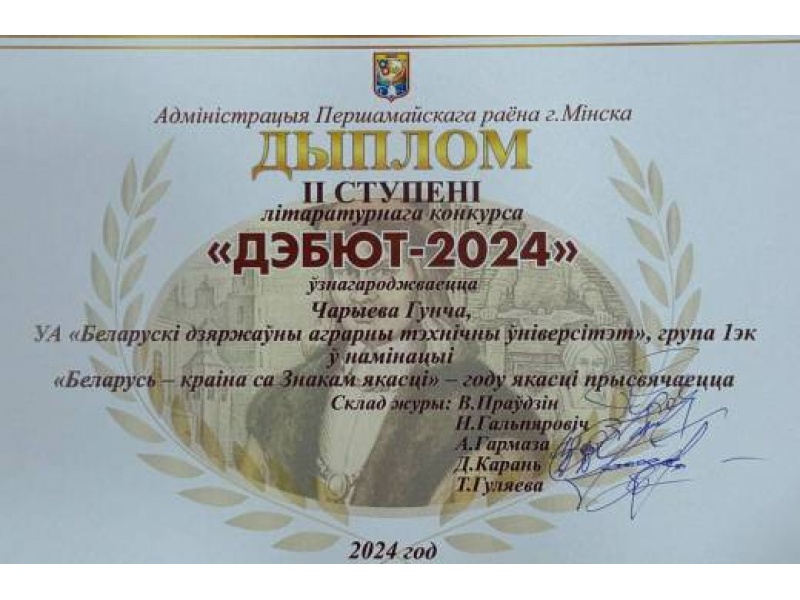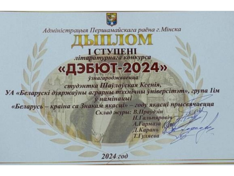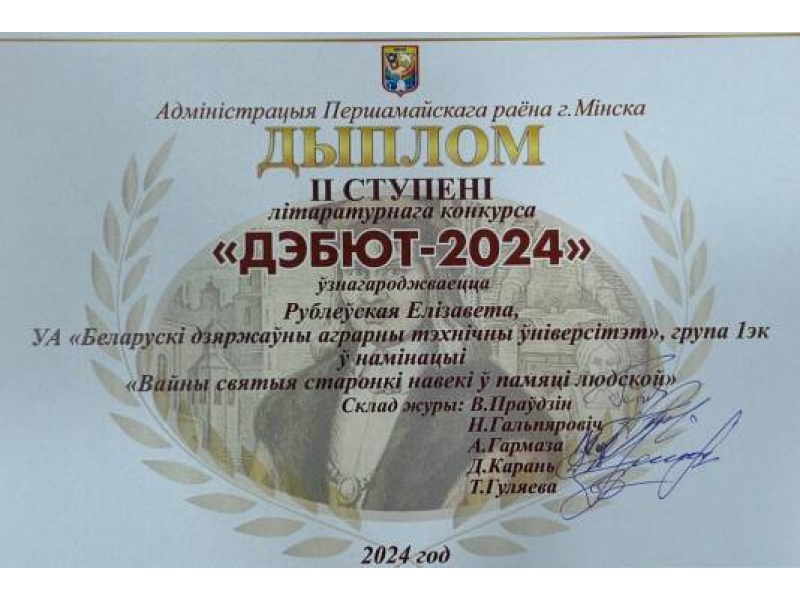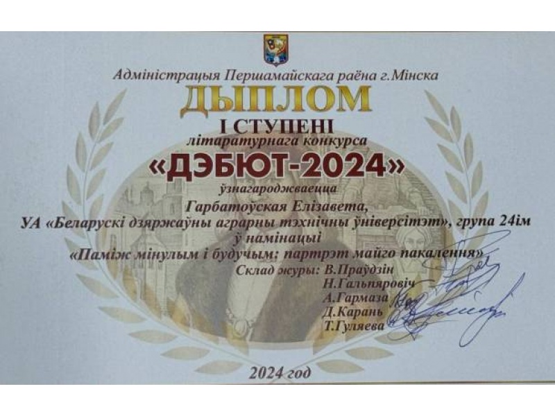 я 2025 года в Первомайском районе г.Минска подведены итоги литературного конкурса «Дебют-2024». Конкурс «Дебют» стал заметным явлением в творческой жизни Первомайского района столицы. Он позволяет выявить и поддержать сотни талантов.