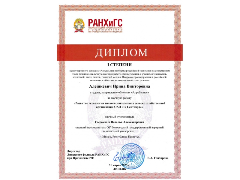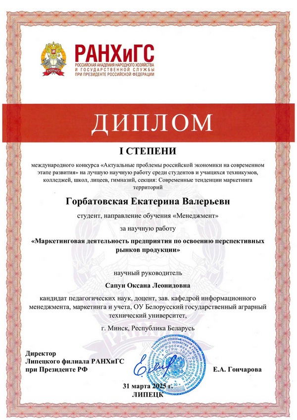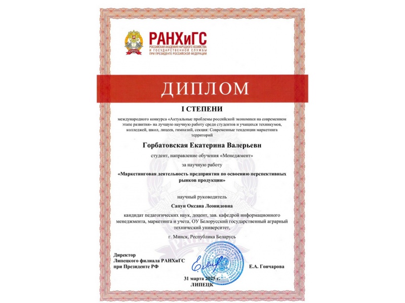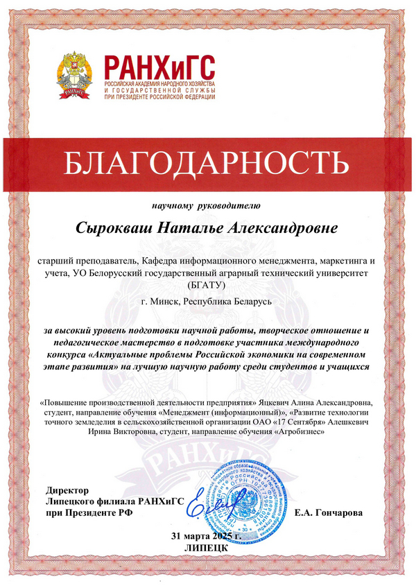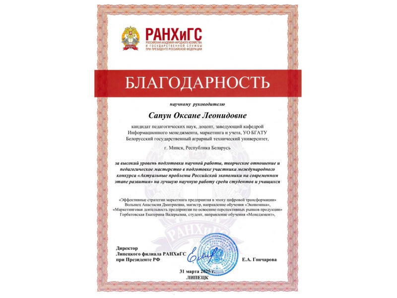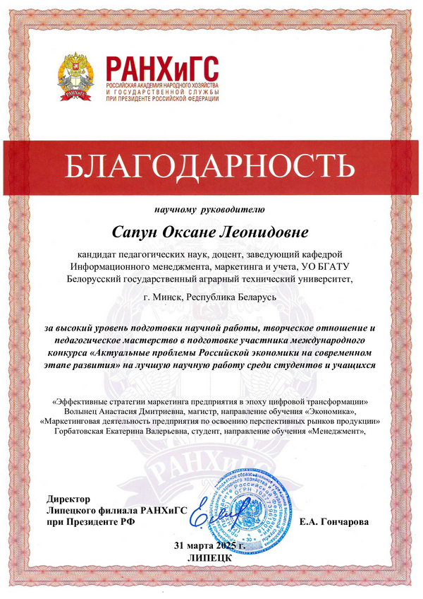 По итогам международного конкурса «Актуальные проблемы российской экономики на современном этапе развития», Российская академия народного хозяйства и государственной службы при Президенте Российской Федерации, г. Липецк, студенты нашего ВУЗа под руководством Сапун О.Л и Сырокваш Н.А. заняли призовые места .