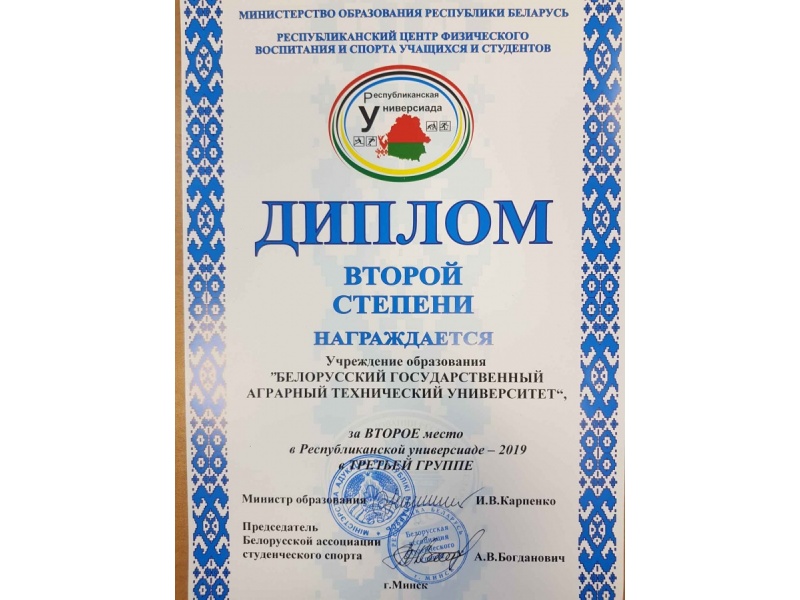 В Республиканской универсиаде-2019 сборные команды БГАТУ приняли участие в 25 спортивных дисциплинах. Наибольшего успеха наши спортсмены достигли в следующих видах спорта: 2-е место – тайландский бокс (тренеры-преподаватели – Григоров А.В., Степанов М.Н., Жуковский Ю.Н.) , 3-е место - тяжелая атлетика (тренер-преподаватель – Свиридов Ю.В.), 6-е место - бокс (тренер-преподаватель Мацкело В.И.) и волейбол (мужчины, тренер-преподаватель Жданович А.Ф.).