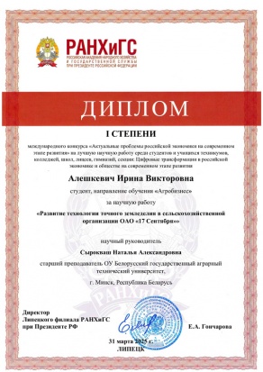 По итогам международного конкурса «Актуальные проблемы российской экономики на современном этапе развития», Российская академия народного хозяйства и государственной службы при Президенте Российской Федерации, г. Липецк, студенты нашего ВУЗа под руководством Сапун О.Л и Сырокваш Н.А. заняли призовые места .