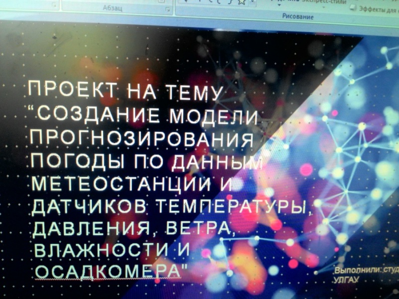 - «АФГ-Националь» на тему «Создание модели прогнозирования погоды по данным метеостанции и датчиков температуры, давления, ветра, влажности и осадкомера»;