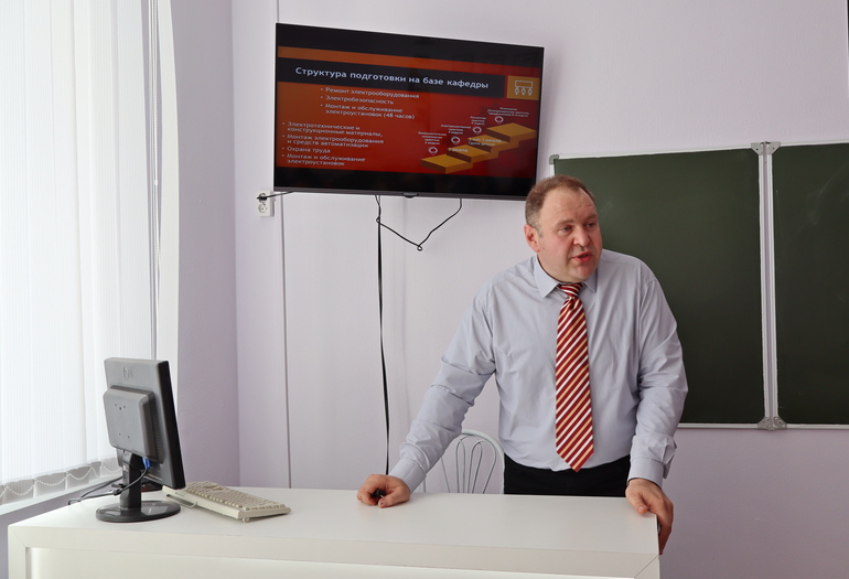 Заведующий кафедрой практической подготовки студентов Барайшук С.М. рассказал об особенностях подготовки студентов по рабочим профессиям в БГАТУ («Электромонтер по ремонту и обслуживанию электрооборудования»), об опыте реализации производственного обучения на базе кафедры «Практическая подготовка студентов». Интерактивные симуляции для практических занятий позволяют студентам экспериментировать с разными сценариями и наблюдать результаты в реальном времени. VR технология помогает записывать и анализировать действия студентов. Для практического обучения на кафедре смоделированы VR на бензогенераторе и электрозаправочная станция.