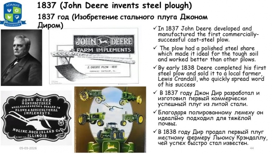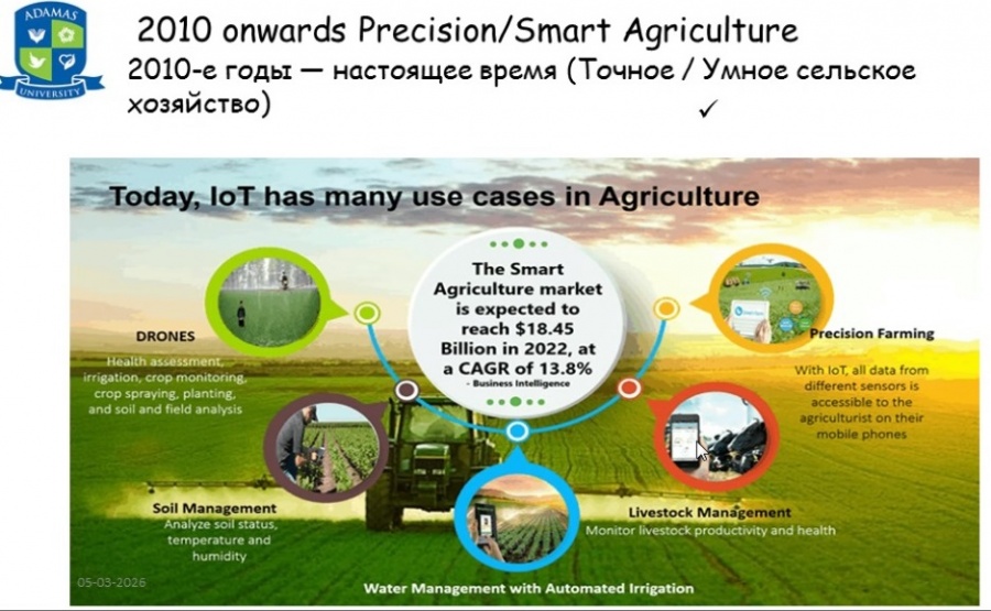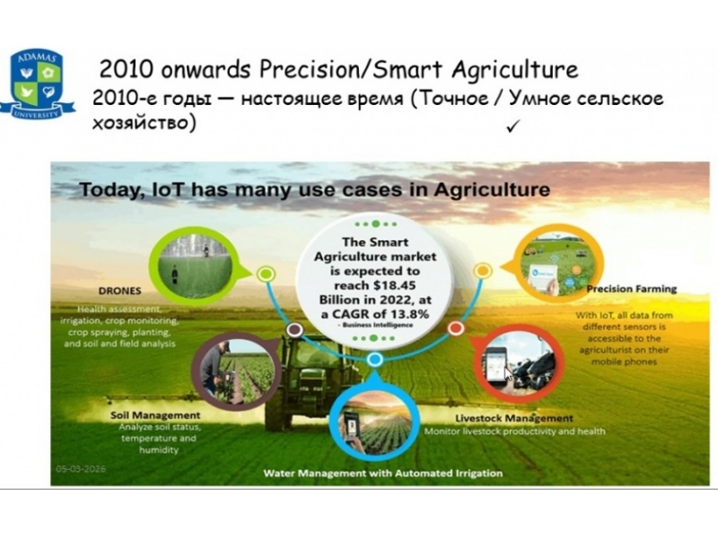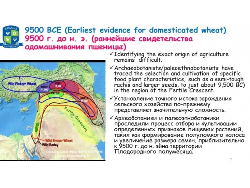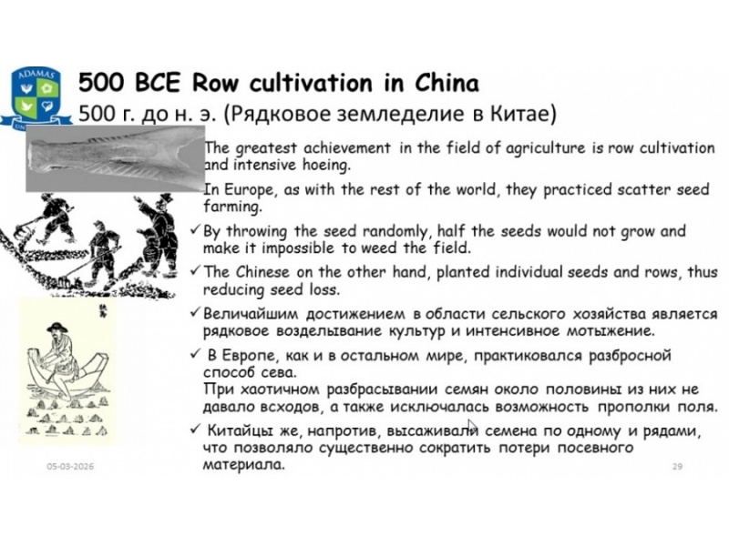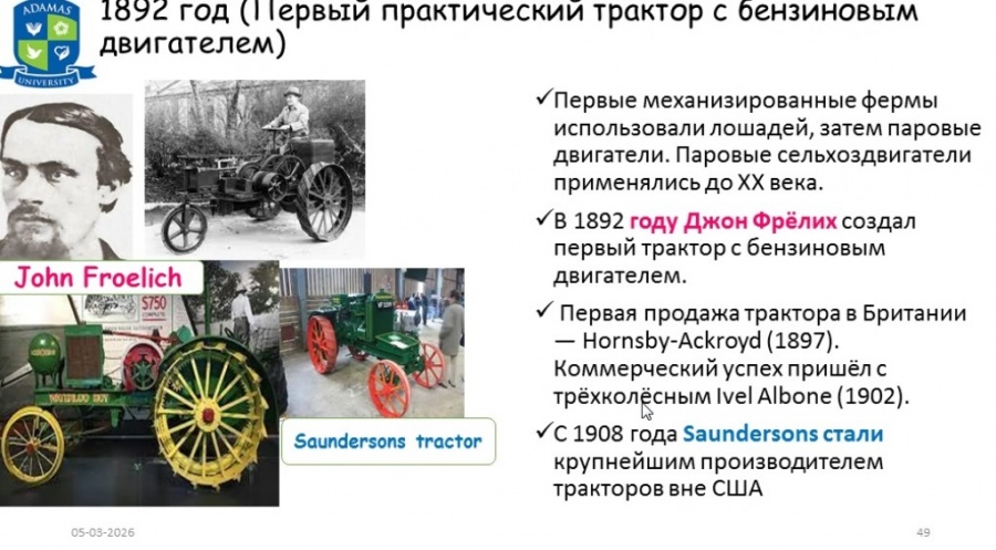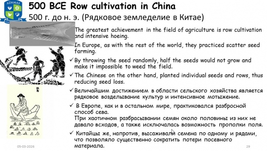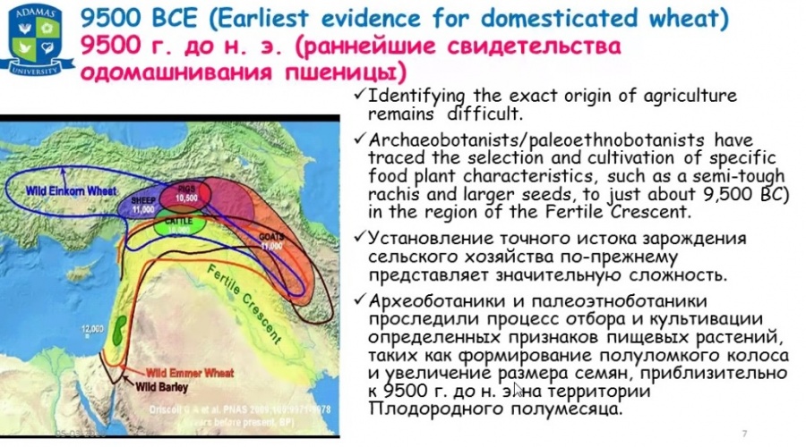 В лекции подробно представлена хронология развития и прогресса сельского хозяйства и смежных с ним наук — от эпохи охоты и собирательства до современного точного земледелия. В ней также освещены вопросы доместикации основных сельскохозяйственных культур и видов скота, а также её значение. Кроме того, рассмотрены некоторые ключевые исторические вехи, связанные с агрономией, механизацией, зоотехнией и смежными дисциплинами, их роль в обеспечении глобальной продовольственной безопасности на современном этапе.