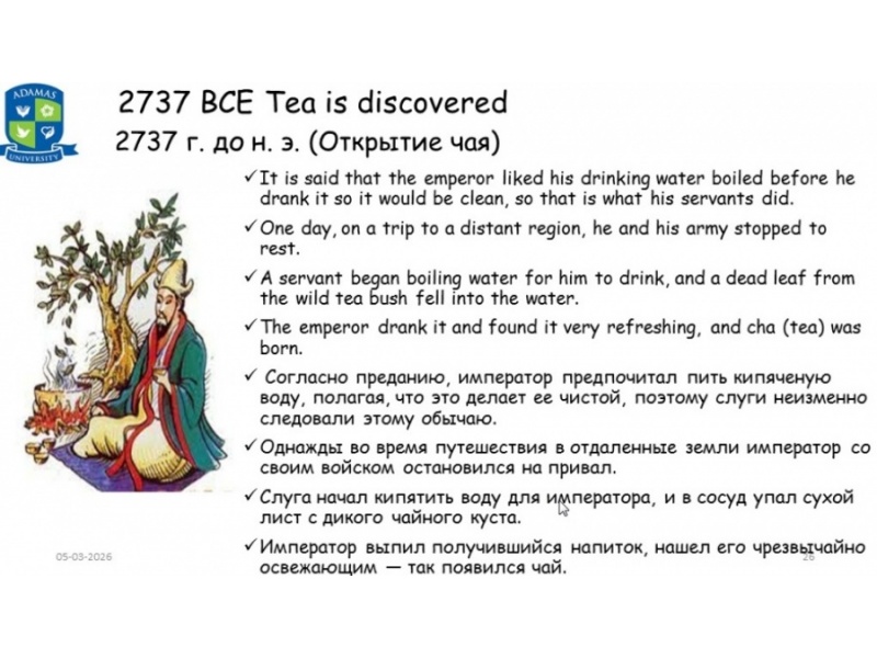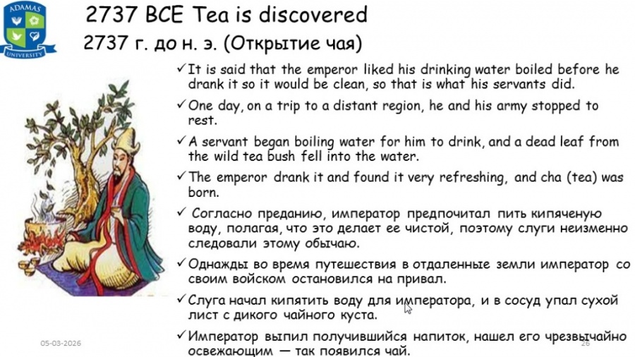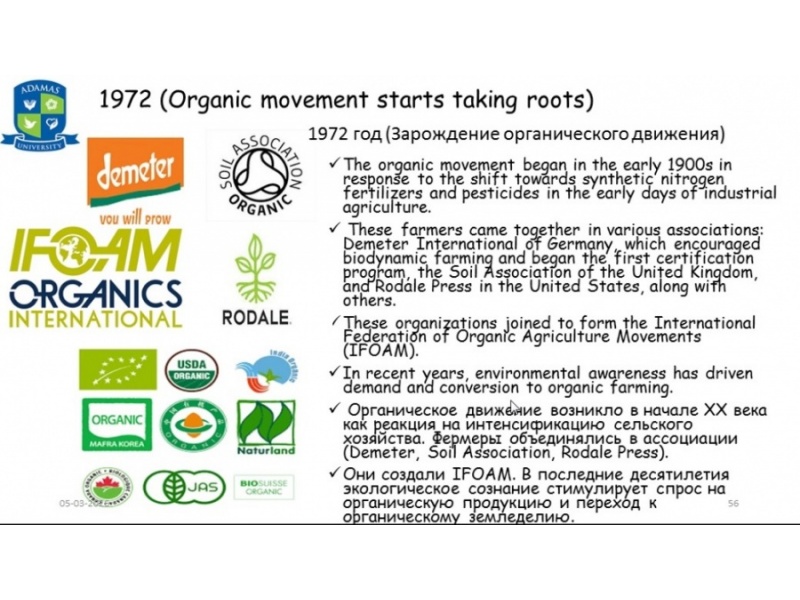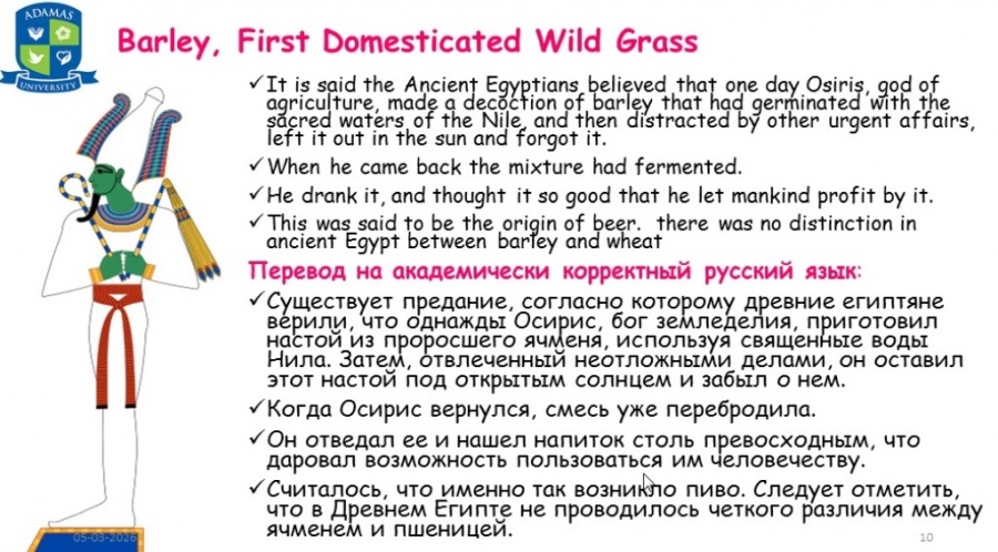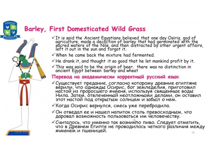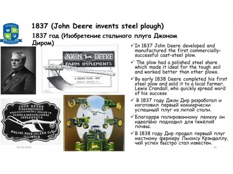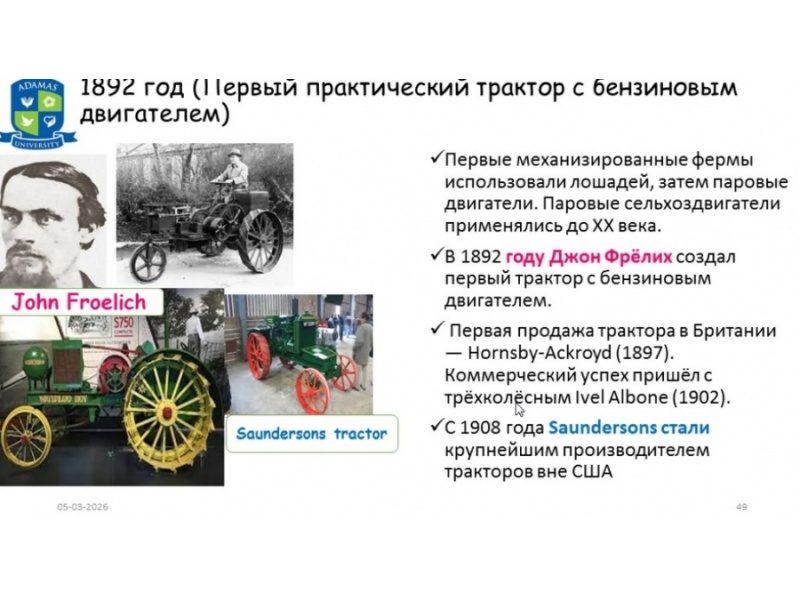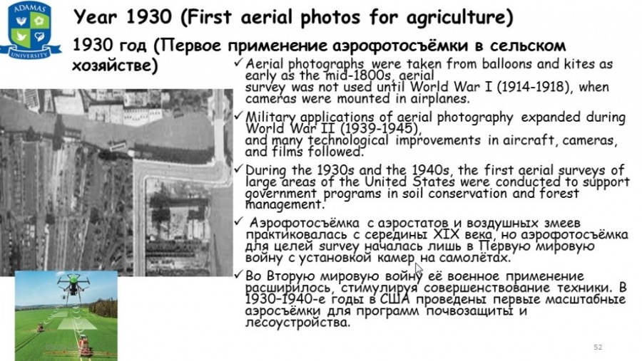 В лекции подробно представлена хронология развития и прогресса сельского хозяйства и смежных с ним наук — от эпохи охоты и собирательства до современного точного земледелия. В ней также освещены вопросы доместикации основных сельскохозяйственных культур и видов скота, а также её значение. Кроме того, рассмотрены некоторые ключевые исторические вехи, связанные с агрономией, механизацией, зоотехнией и смежными дисциплинами, их роль в обеспечении глобальной продовольственной безопасности на современном этапе.