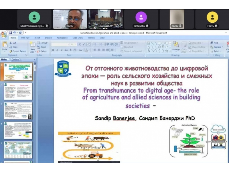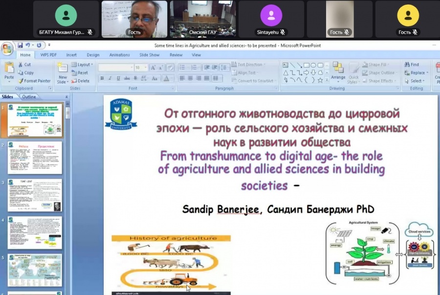 В рамках реализации Соглашения о сотрудничестве в области науки, образования и дополнительного образования взрослых с ФГБОУ ВО «Омский государственный аграрный университет имени П.А. Столыпина» 05.03.2026 представители БГАТУ приняли участие в онлайн-лекции профессора, доктора Сандипа Баннерджи, заместителя декана факультета интеллектуального сельского хозяйства университета Адамас (Индия) на тему «От пастбищного животноводства к цифровой эпохе: роль сельского хозяйства и смежных наук в развитии общества».