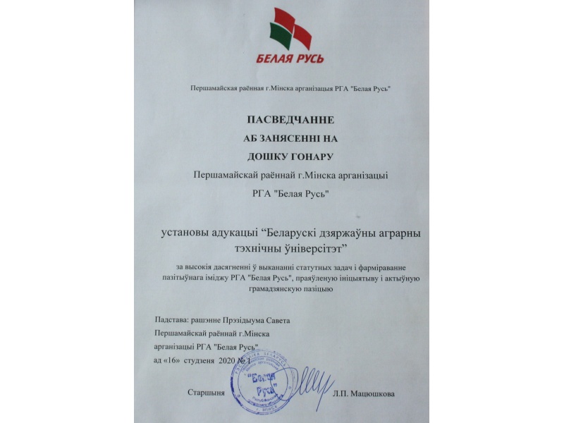 12 марта 2020 года в администрации Первомайского района г. Минска состоялось чествование победителей смотра-конкурса на лучшую первичную организацию РОО «Белая Русь» в Первомайском районе столицы и занесение на Доску почета. Второй год подряд первичная организация БГАТУ РОО «Белая Русь» в Первомайском районе заносится на Доску почета за высокие достижения в выполнении уставных задач и формирование позитивного имиджа РОО «Белая Русь», а также проявленную инициативу и активную общественную позицию.