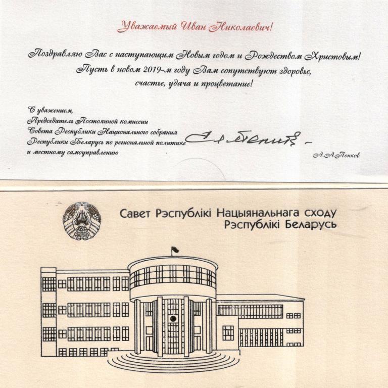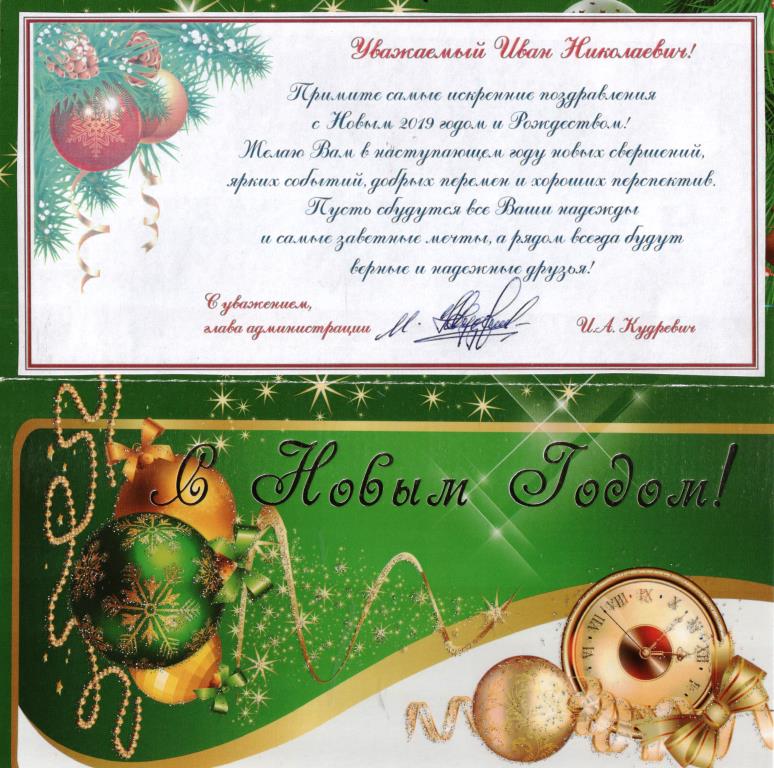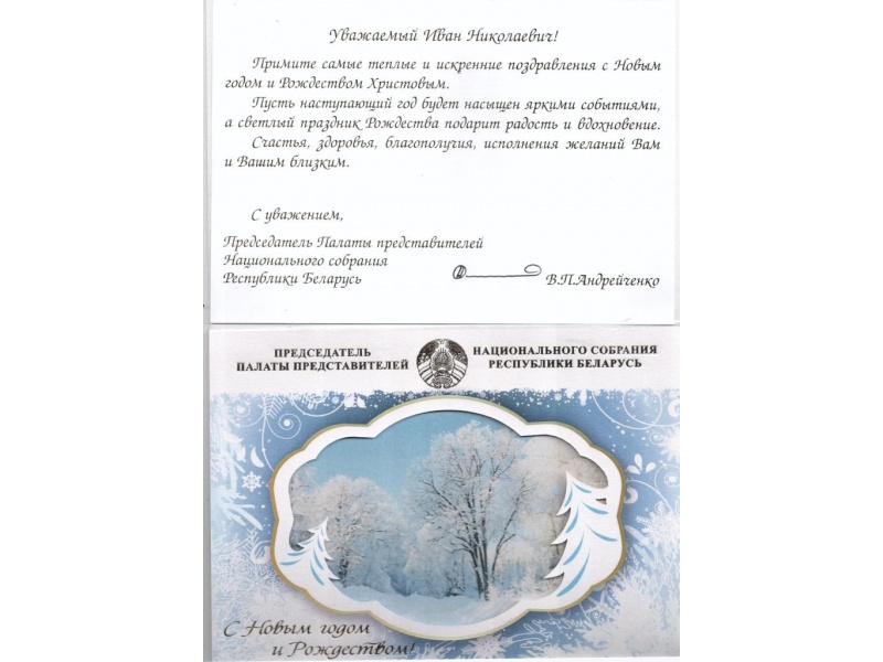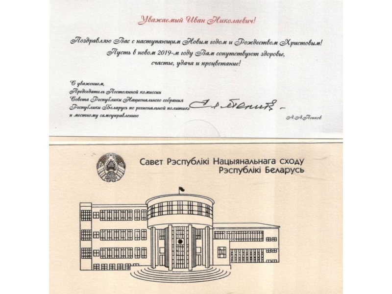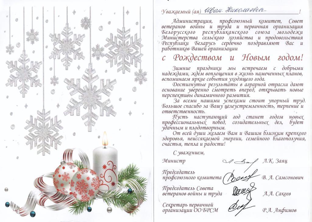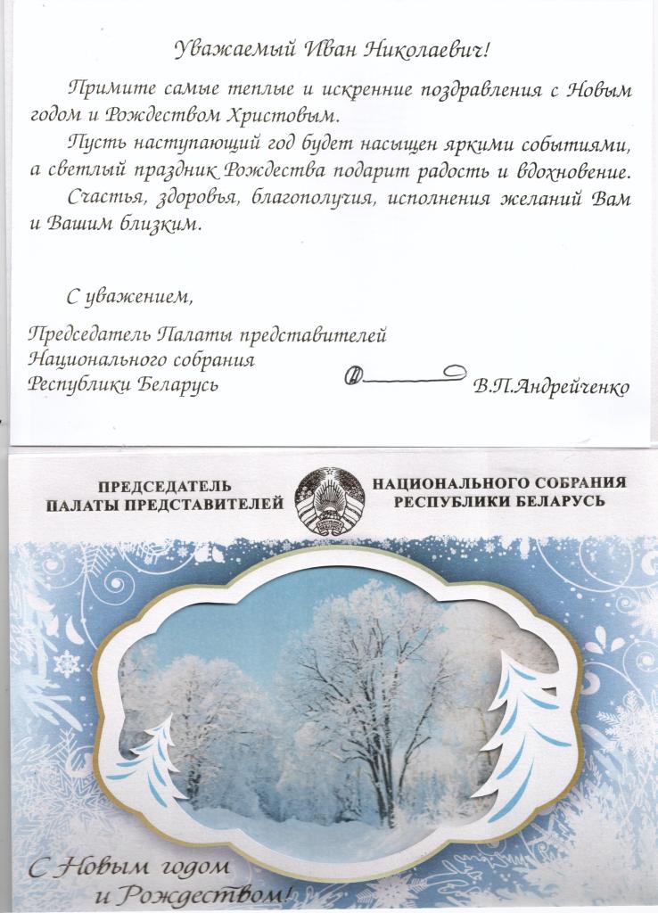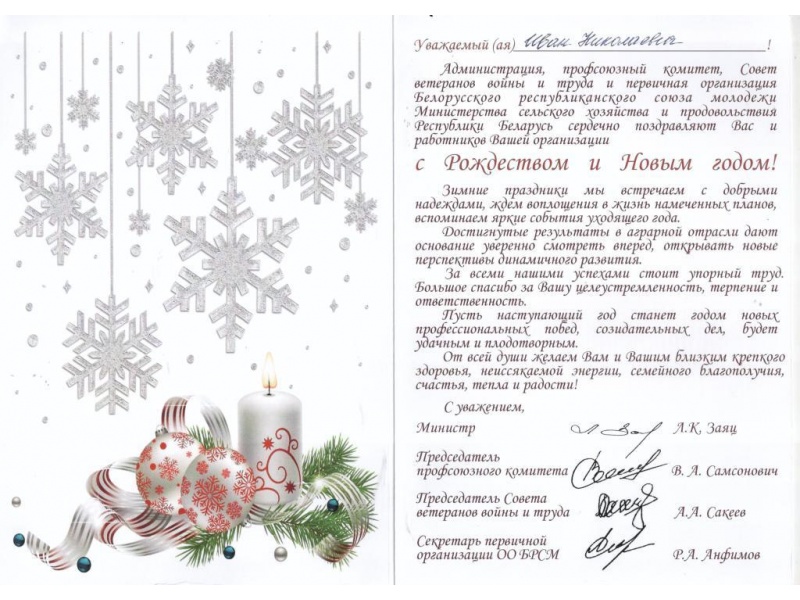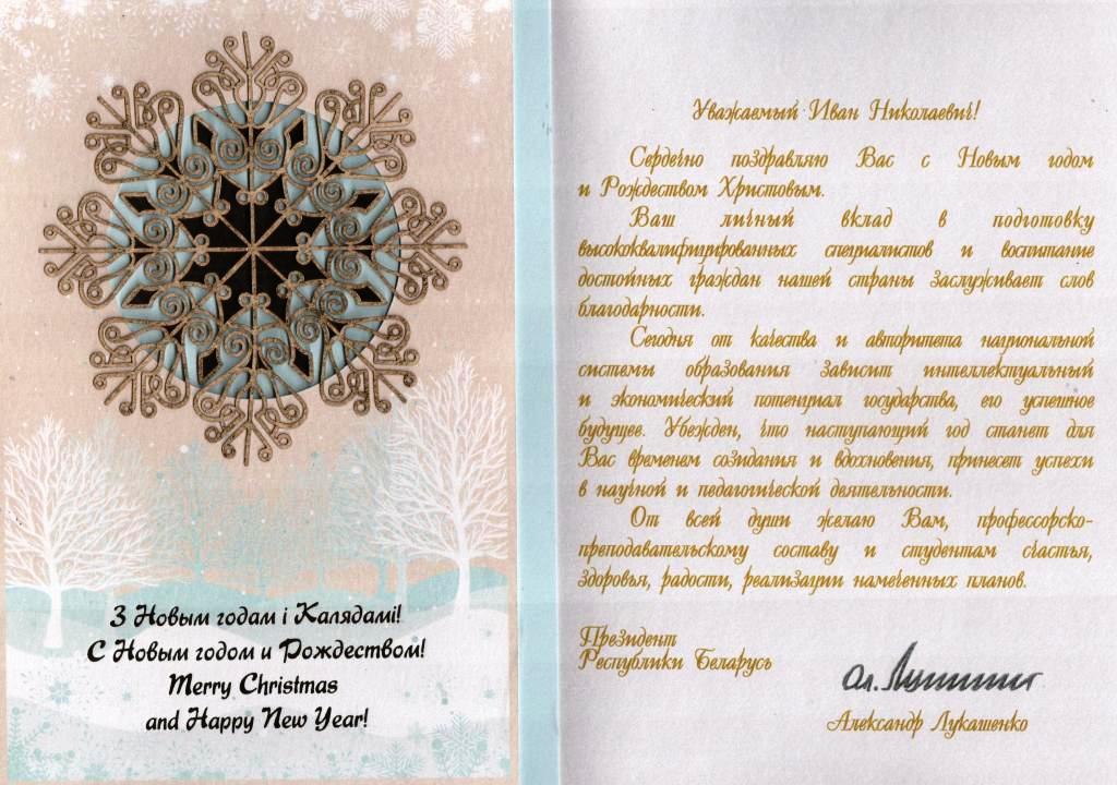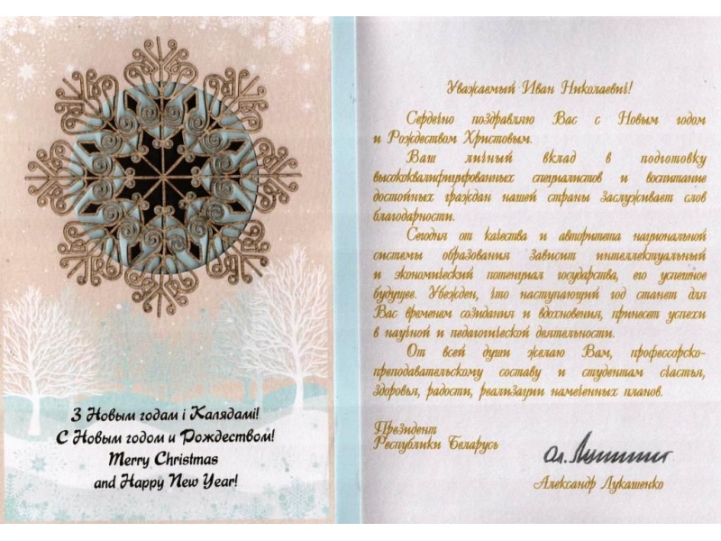 Многочисленные поздравления с новогодними праздниками приходят на имя ректора Белорусского государственного аграрного технического университета Шило Ивана Николаевича. Отрадно, что поздравления получены от Президента Республики Беларусь А.Г. Лукашенко, Председателя Палаты представителей Национального собрания Республики Беларусь В.П. Андрейченко, министра сельского хозяйства и продовольствия Республики Беларусь Л.К. Зайца, Председателя Постоянной комиссии Совета Республики Национального собрания Республики Беларусь по региональной политике и местному самоуправлению А.А. Попкова, главы администрации Первомайского района г. Минска И.А. Кудревича, а также коллег, выпускников и друзей университета.