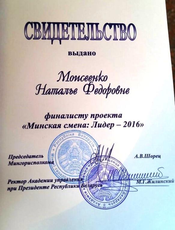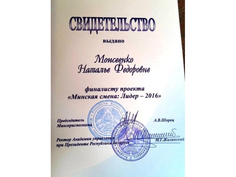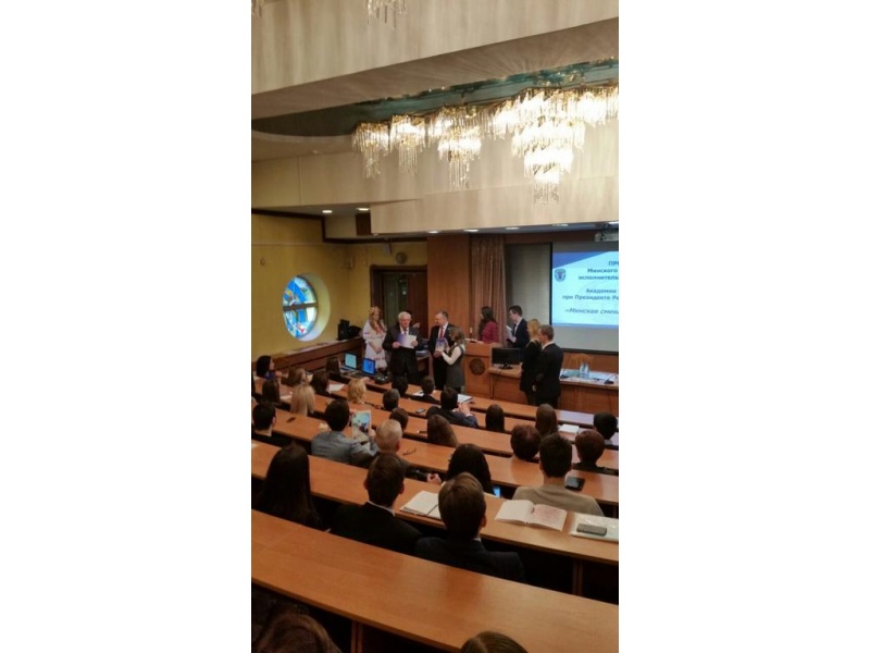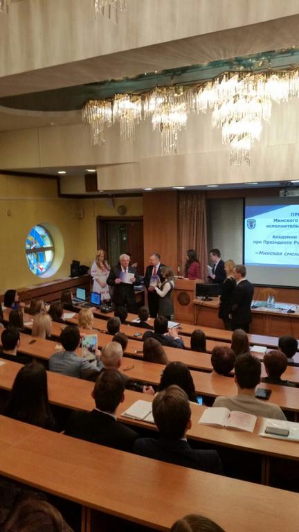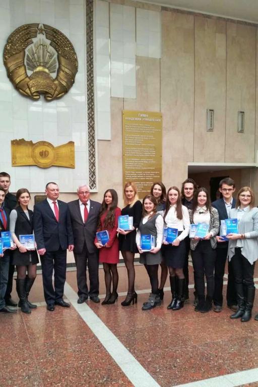 Церемония торжественного закрытия проекта по гражданскому воспитанию молодежи "Минская смена", реализуемого Минским городским исполнительным комитетом и Академией управления при Президенте Республики Беларусь, прошла 2 марта в Академии управления при Президенте. От БГАТУ в церемонии участвовали одни из лучших студентов университета: Мицевич Алина (АЭФ), Коломиец Игорь (ФТС), Корунный Александр (АМФ), Гануш Ольга (ФПУ), а также участница проекта "Минская смена 2016" - Моисеенко Наталья (ИТФ).
