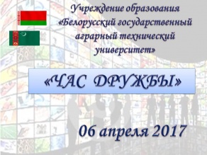 6 апреля 2017 года в БГАТУ прошло мероприятие "Час дружбы" для туркменских и белорусских обучающихся по итогам официального визита Президента Республики Беларусь в Туркменистан. На мероприятии присутствовал атташе посольства Туркмении.